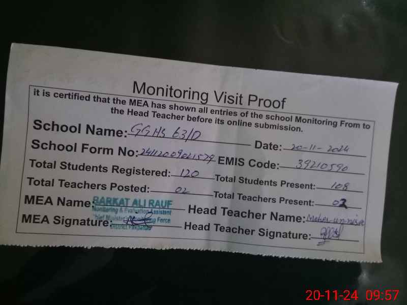 | EMIS Code: 39210590 | Name of School: GGHS 63/D CHOWK SIKANDER | |||