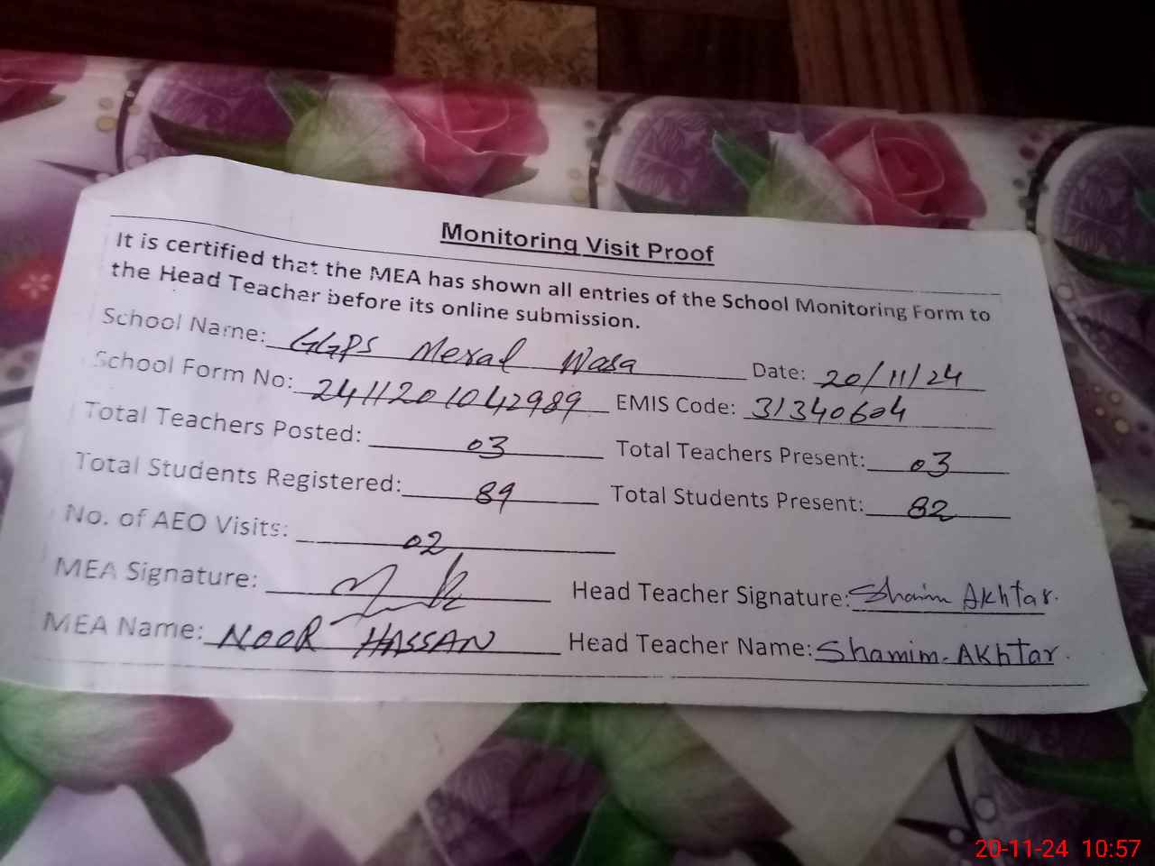 | Attendance Register | Head Teacher | MEA with School | Visit Proof |