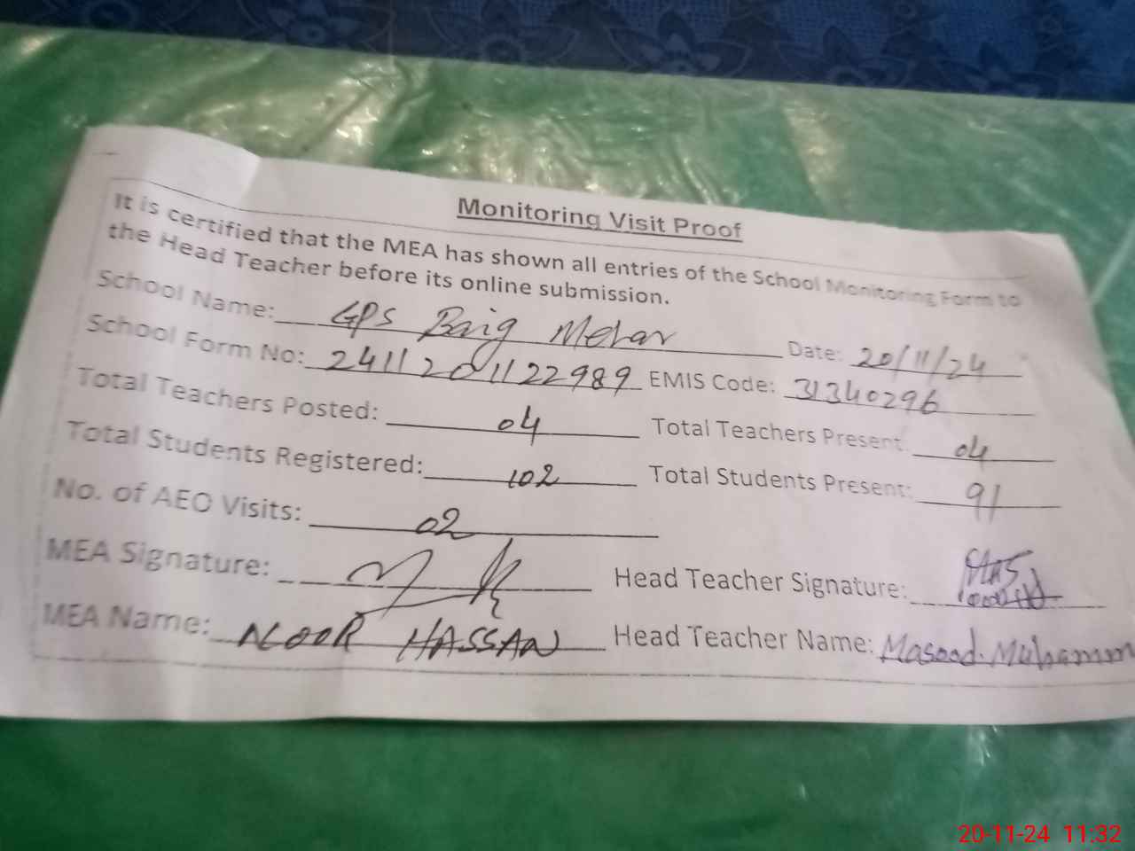 | EMIS Code: 31340296 | Name of School: GPS BAIG MEHAR | |||