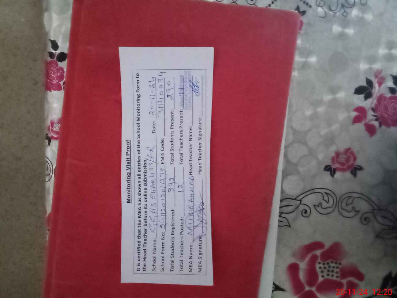 | Attendance Register | Head Teacher | MEA with School | Visit Proof |