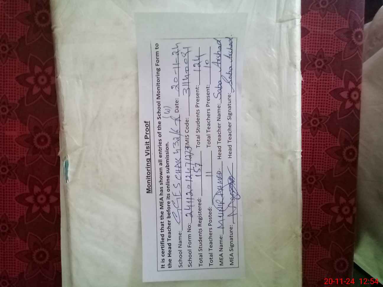 | Attendance Register | Head Teacher | MEA with School | Visit Proof |