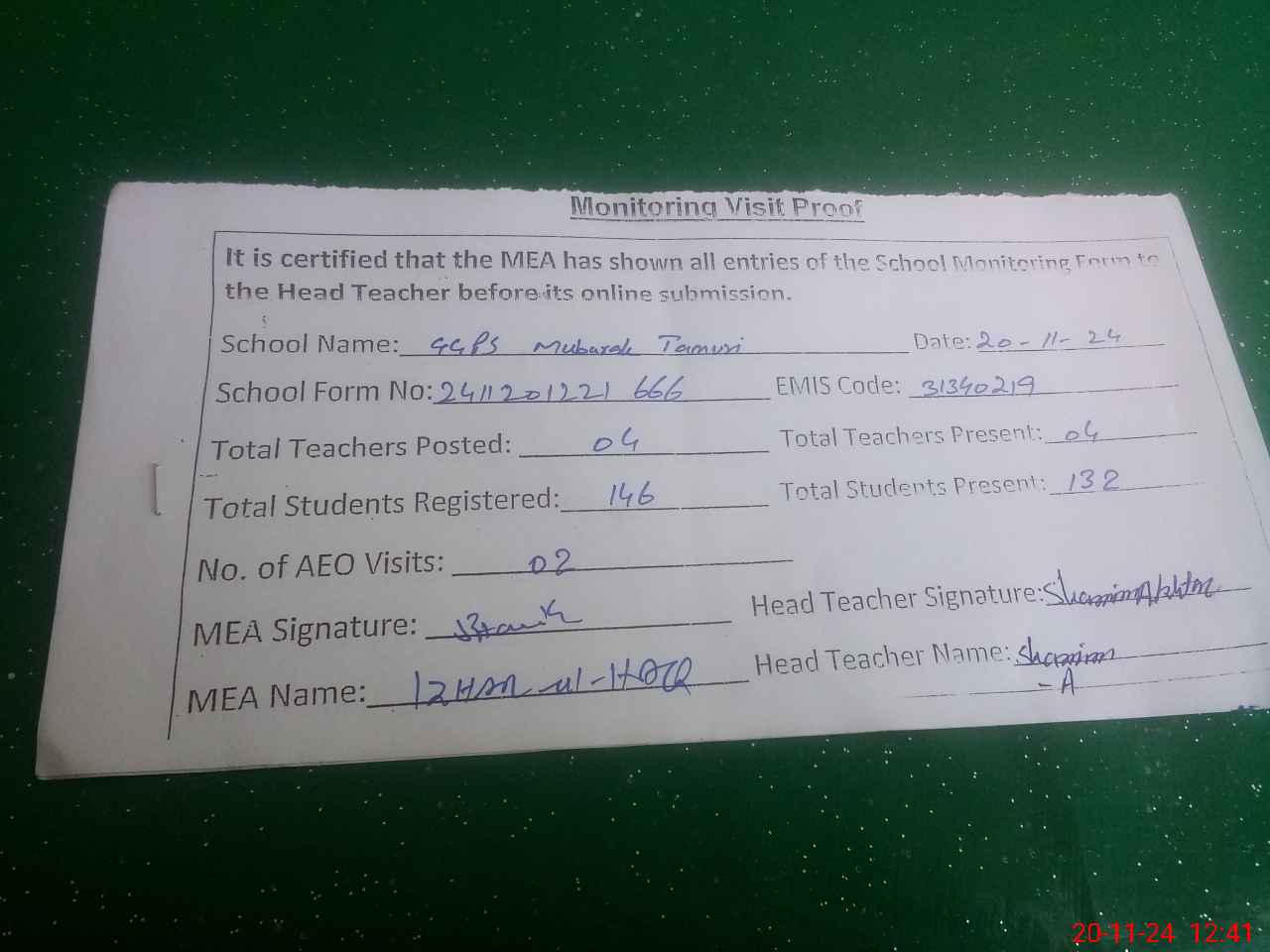 | Attendance Register | Head Teacher | MEA with School | Visit Proof |
