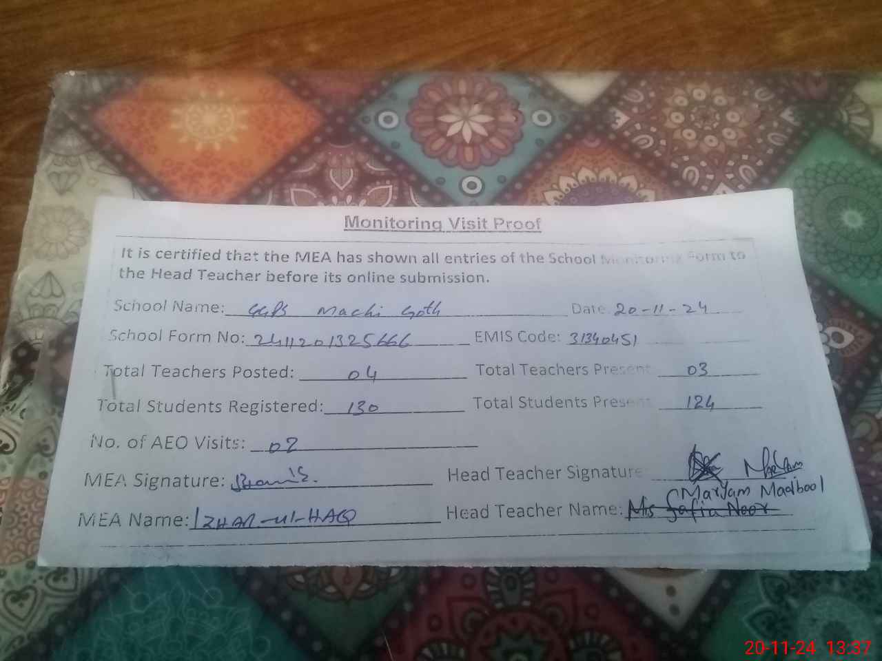 | EMIS Code: 31340451 | Name of School: GGPS MACHHI GOTH | |||