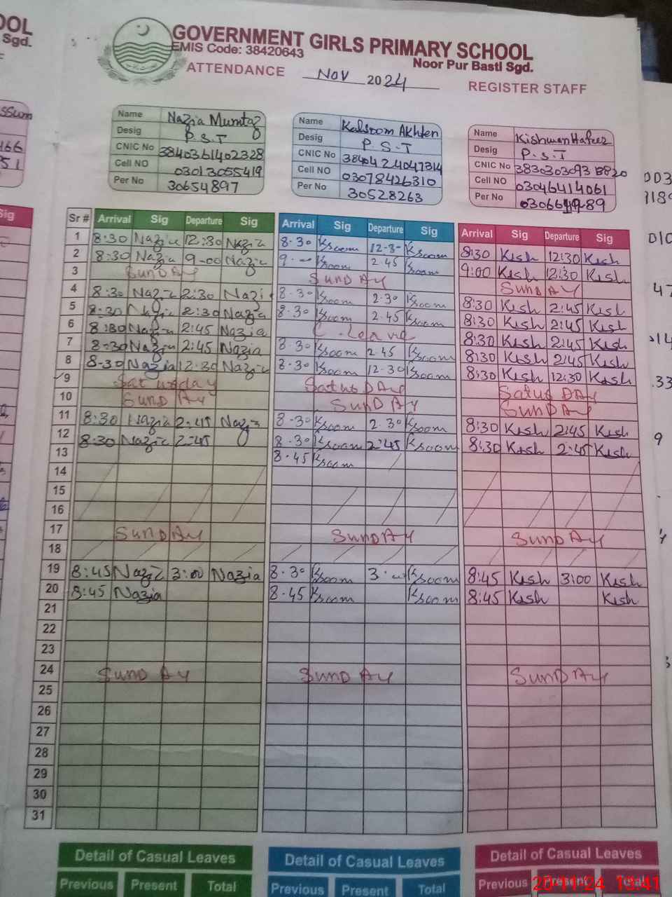| CNIC | Full Name | Designation | R/C | Absence During Last Calender Month |