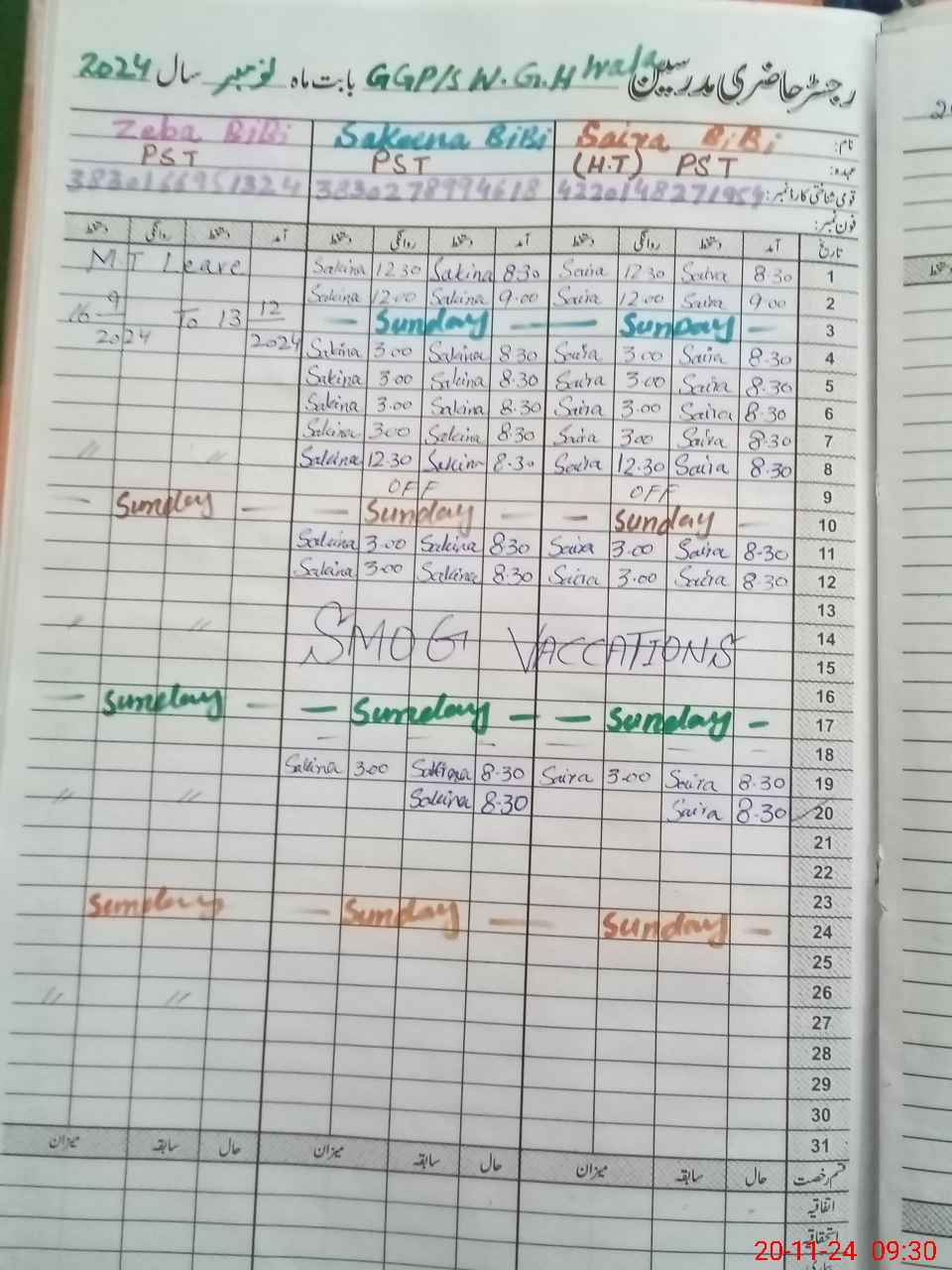 | Remarks (Use Separate Page if Required): Teacher Mrs Zeba Bi Bi marked as absent as she is on MT leave since 16 September 2024 however her leave not approved by the authories concerned till date | |||||