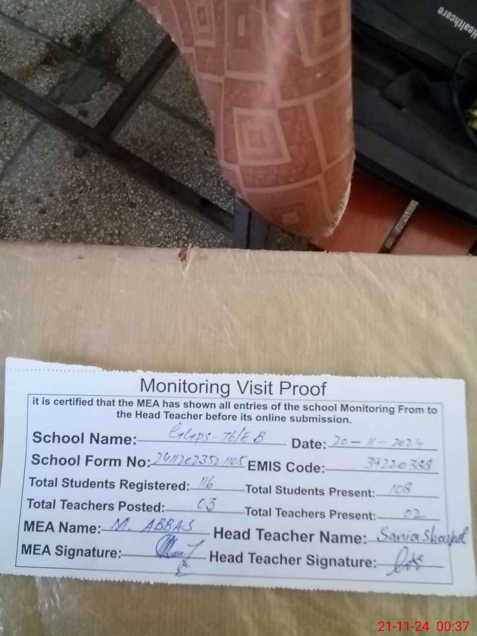 | Attendance Register | Head Teacher | MEA with School | Visit Proof |