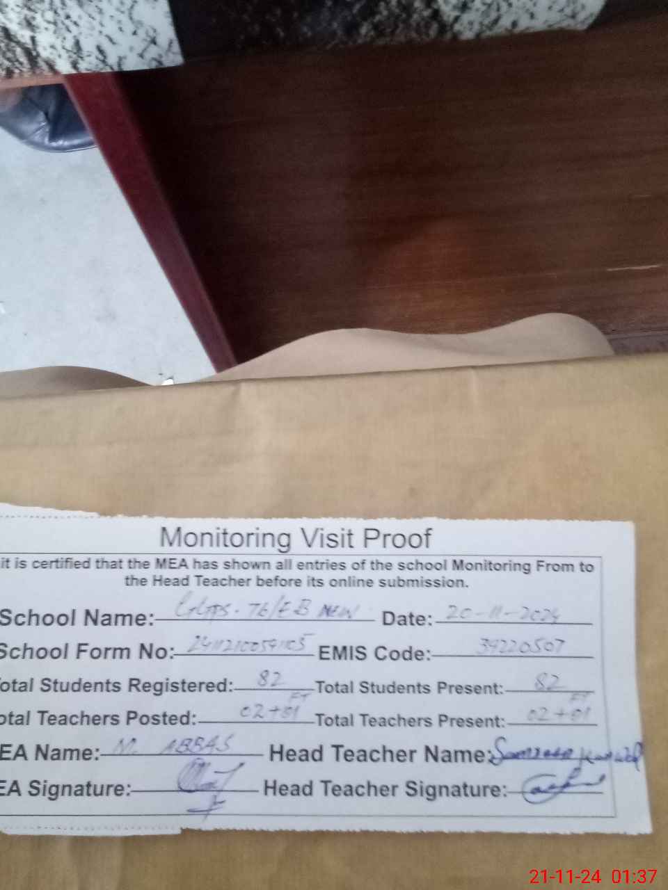| Attendance Register | Head Teacher | MEA with School | Visit Proof |