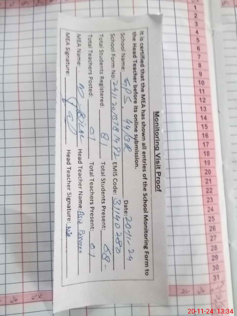 | Attendance Register | Head Teacher | MEA with School | Visit Proof |
