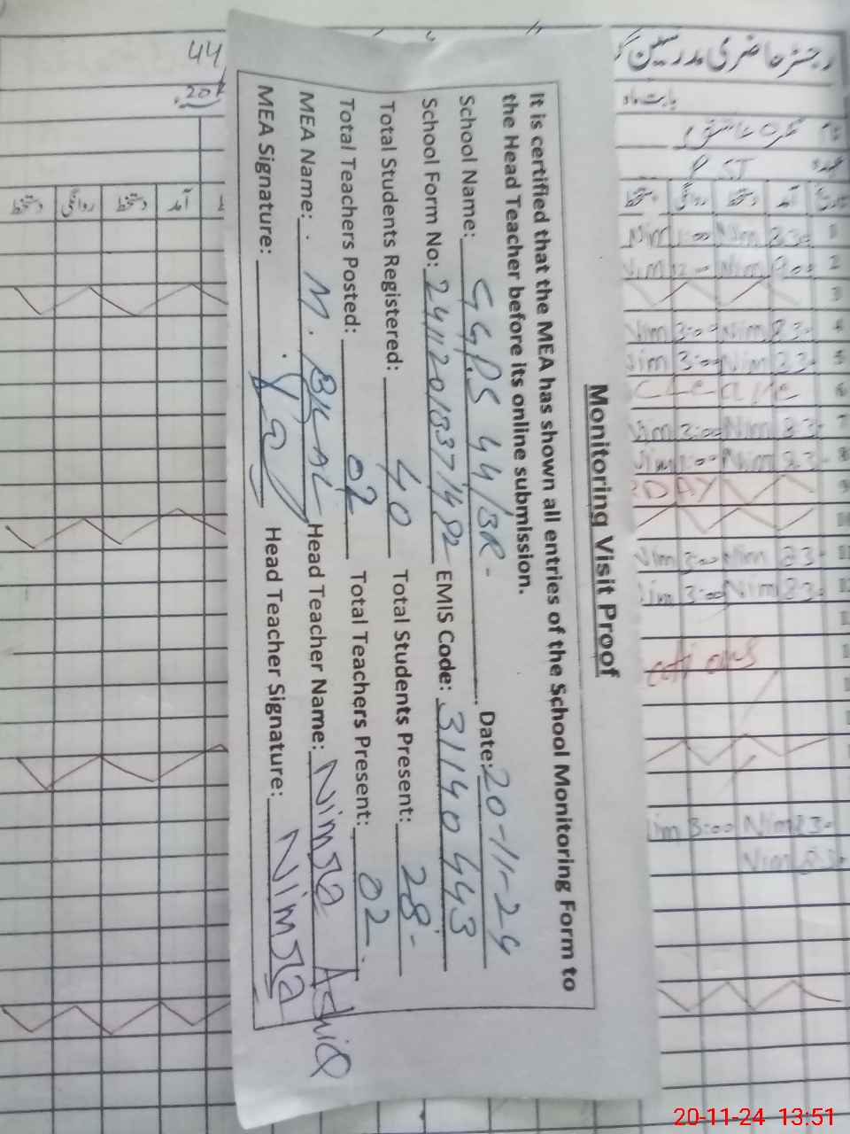 | Attendance Register | Head Teacher | MEA with School | Visit Proof |