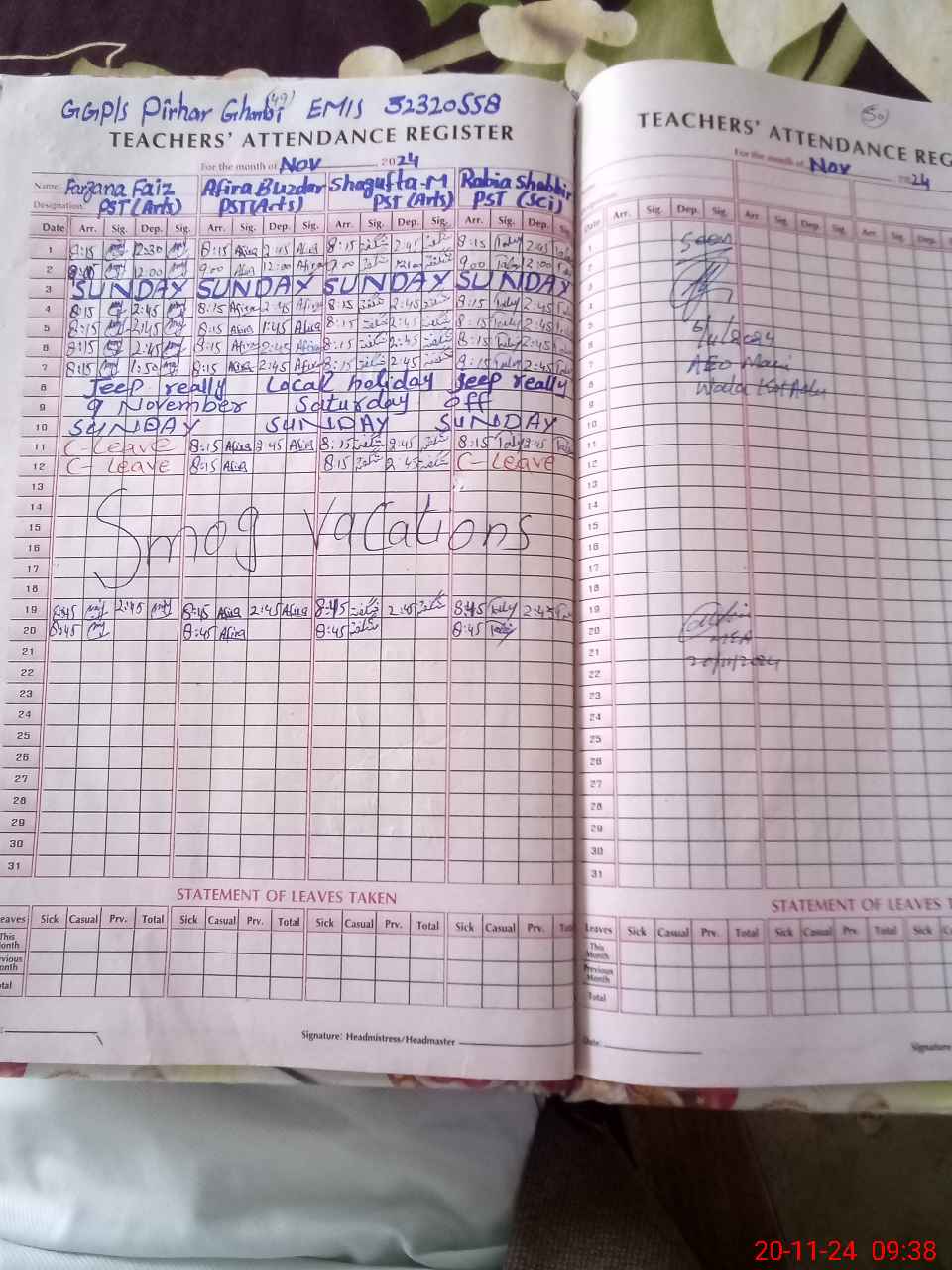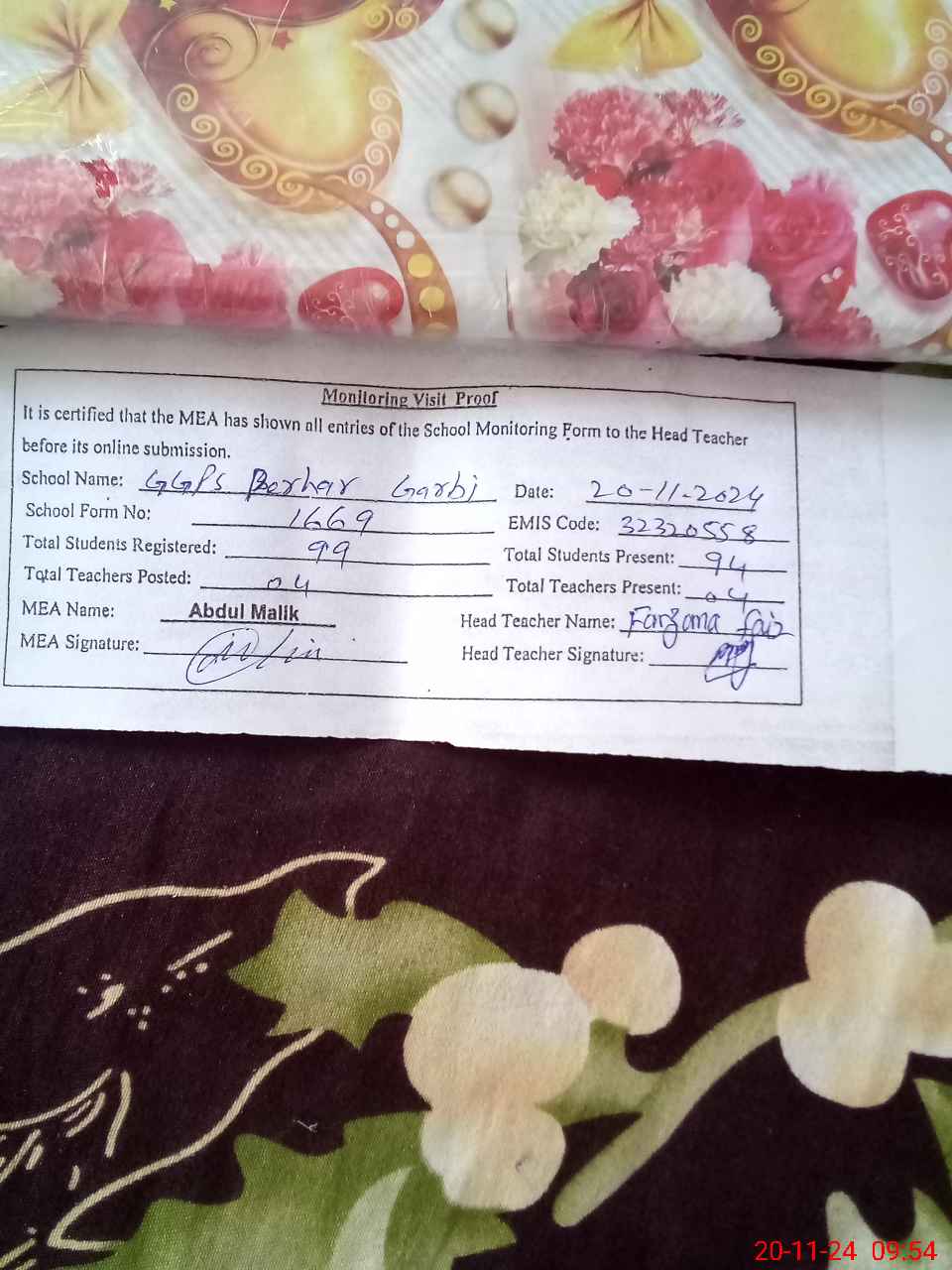| Attendance Register | Head Teacher | MEA with School | Visit Proof |