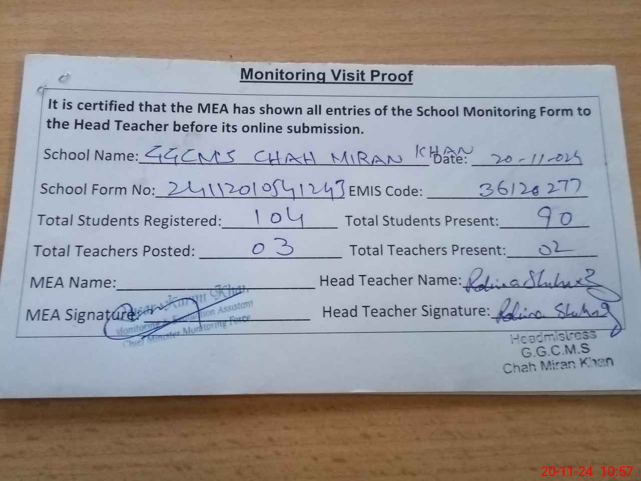 | Attendance Register | Head Teacher | MEA with School | Visit Proof |