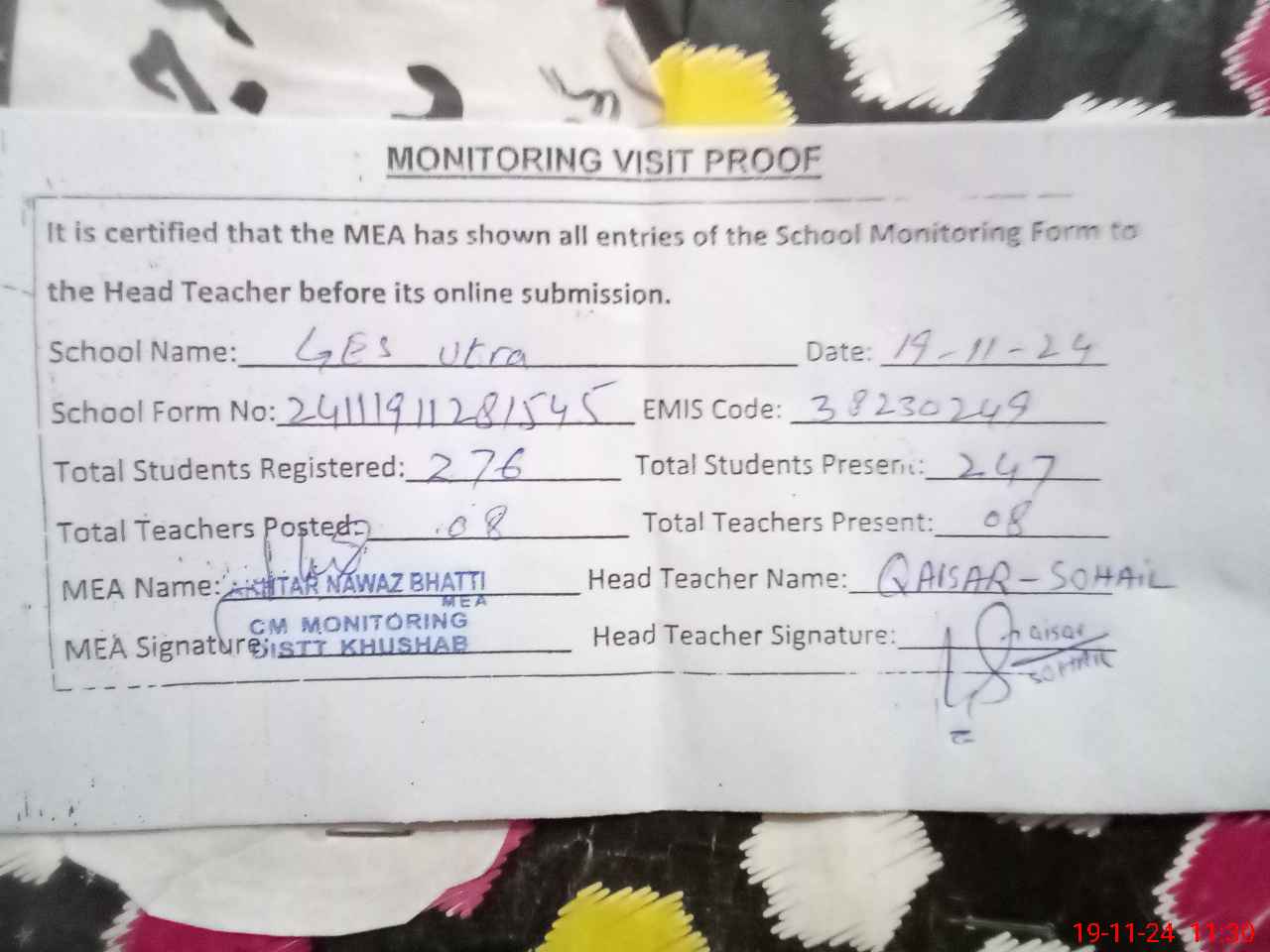 | Certified that this School was Inspected by the Undersigned MEA/DMO Today and the Information Stated Above is as Per Record. | |||||