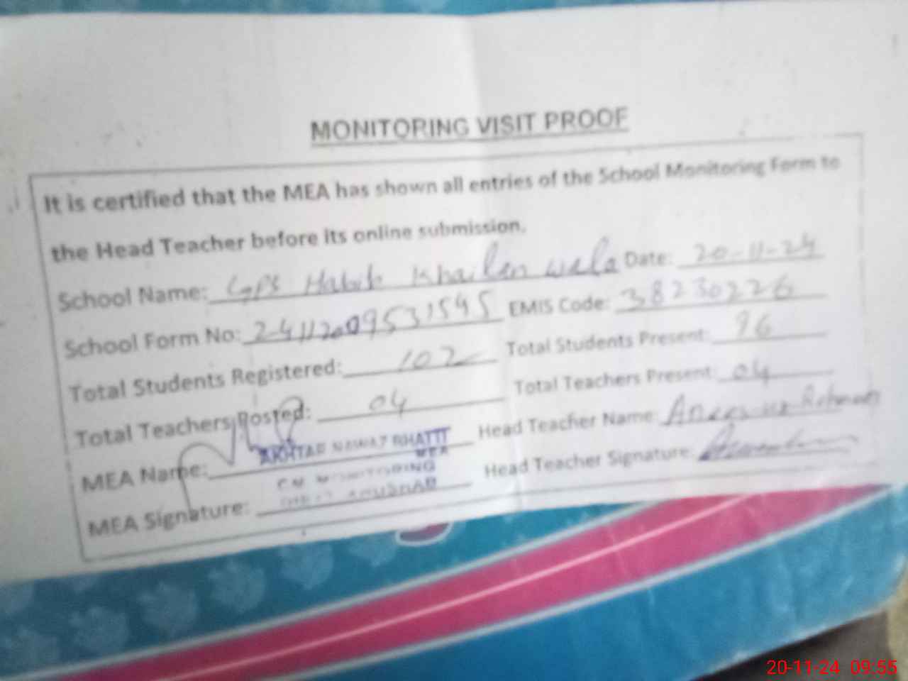 | Attendance Register | Head Teacher | MEA with School | Visit Proof |