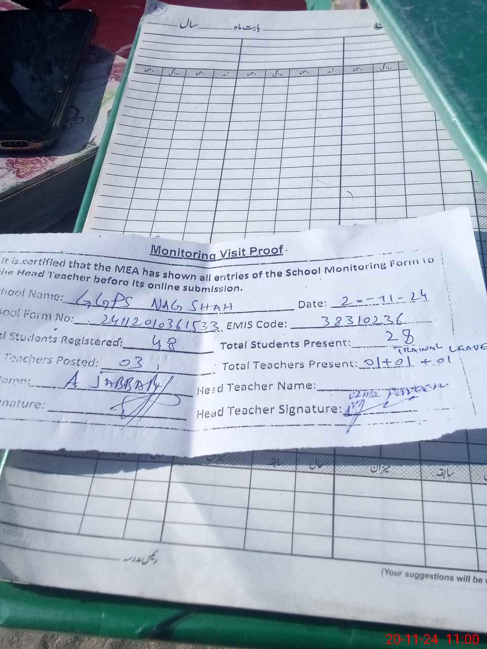 | Attendance Register | Head Teacher | MEA with School | Visit Proof |