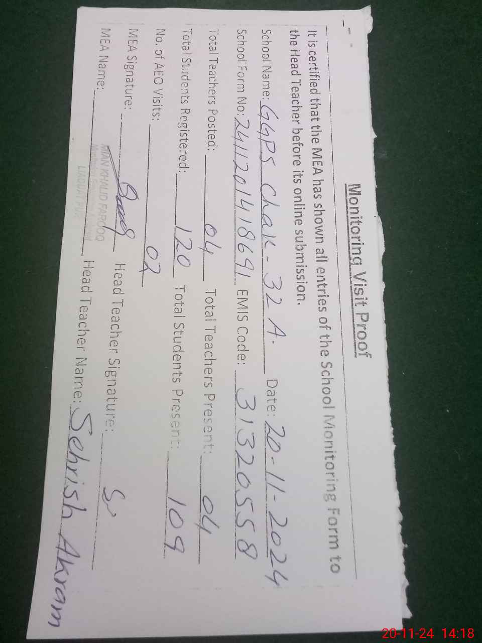 | Attendance Register | Head Teacher | MEA with School | Visit Proof |