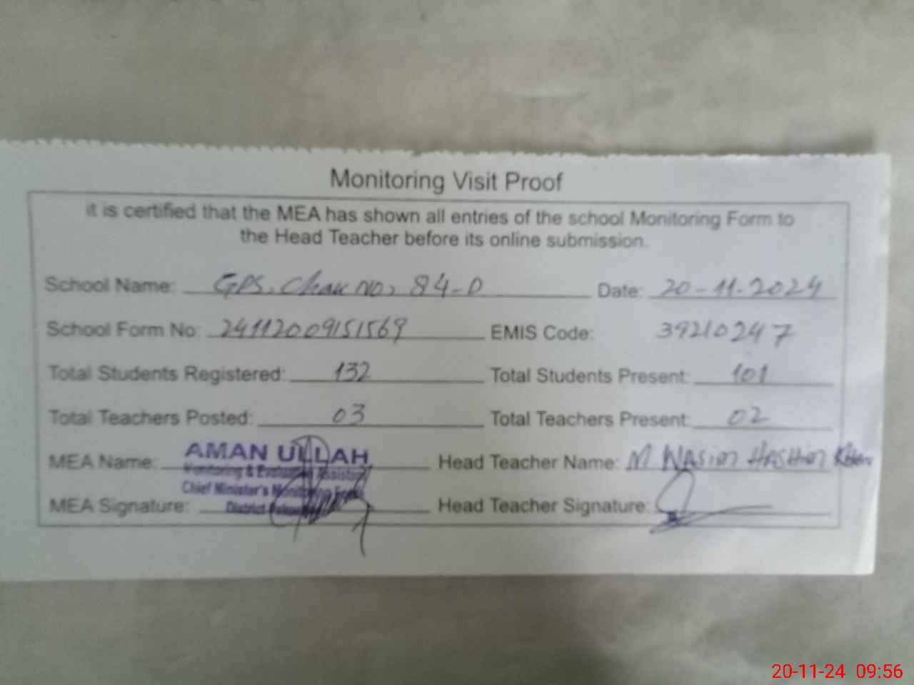 | EMIS Code: 39210247 | Name of School: GPS CHAK NO. 84 / D | |||