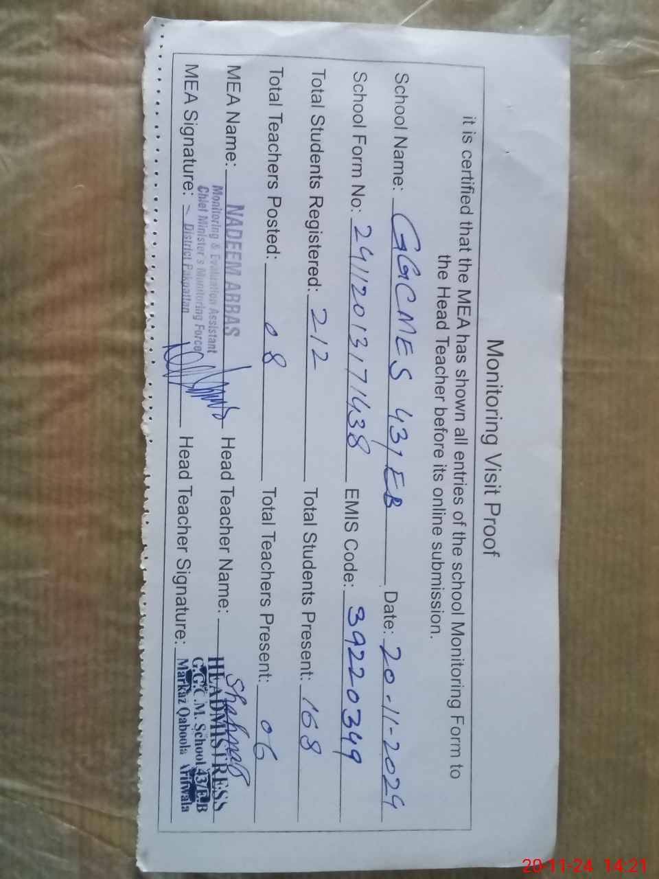 | EMIS Code: 39220349 | Name of School: GGCMES 43 EB P/O KOT KHUDA BUKHSH | |||