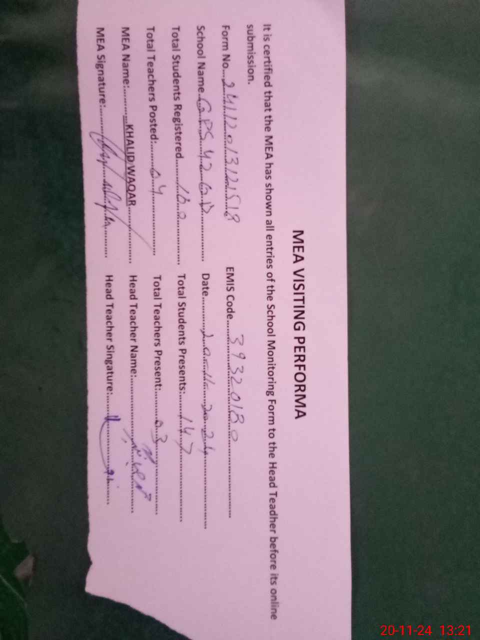 | Attendance Register | Head Teacher | MEA with School | Visit Proof |