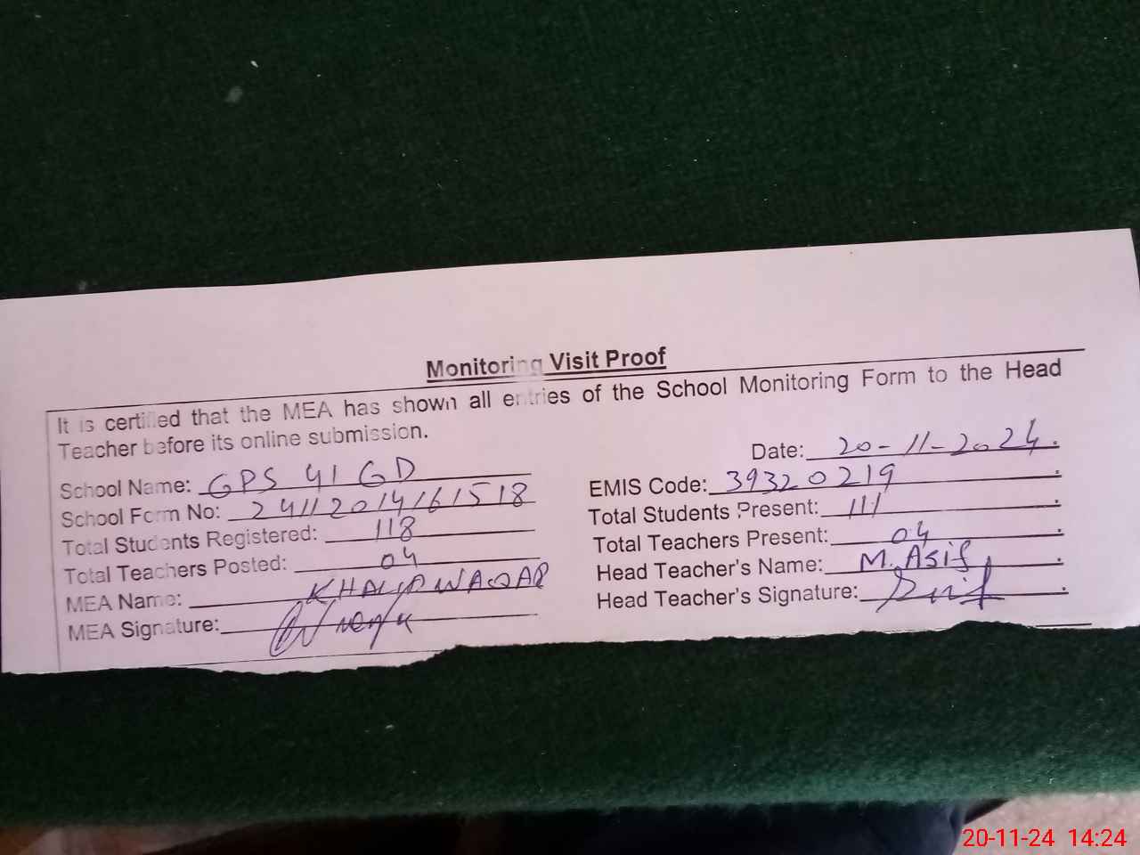 | EMIS Code: 39320219 | Name of School: GPS CHAK NO 41/G.D | |||
