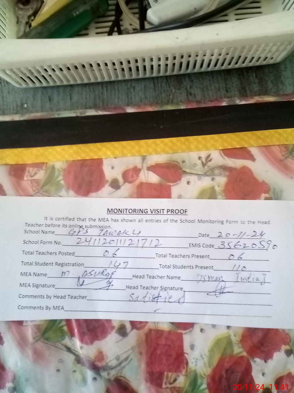 | Attendance Register | Head Teacher | MEA with School | Visit Proof |