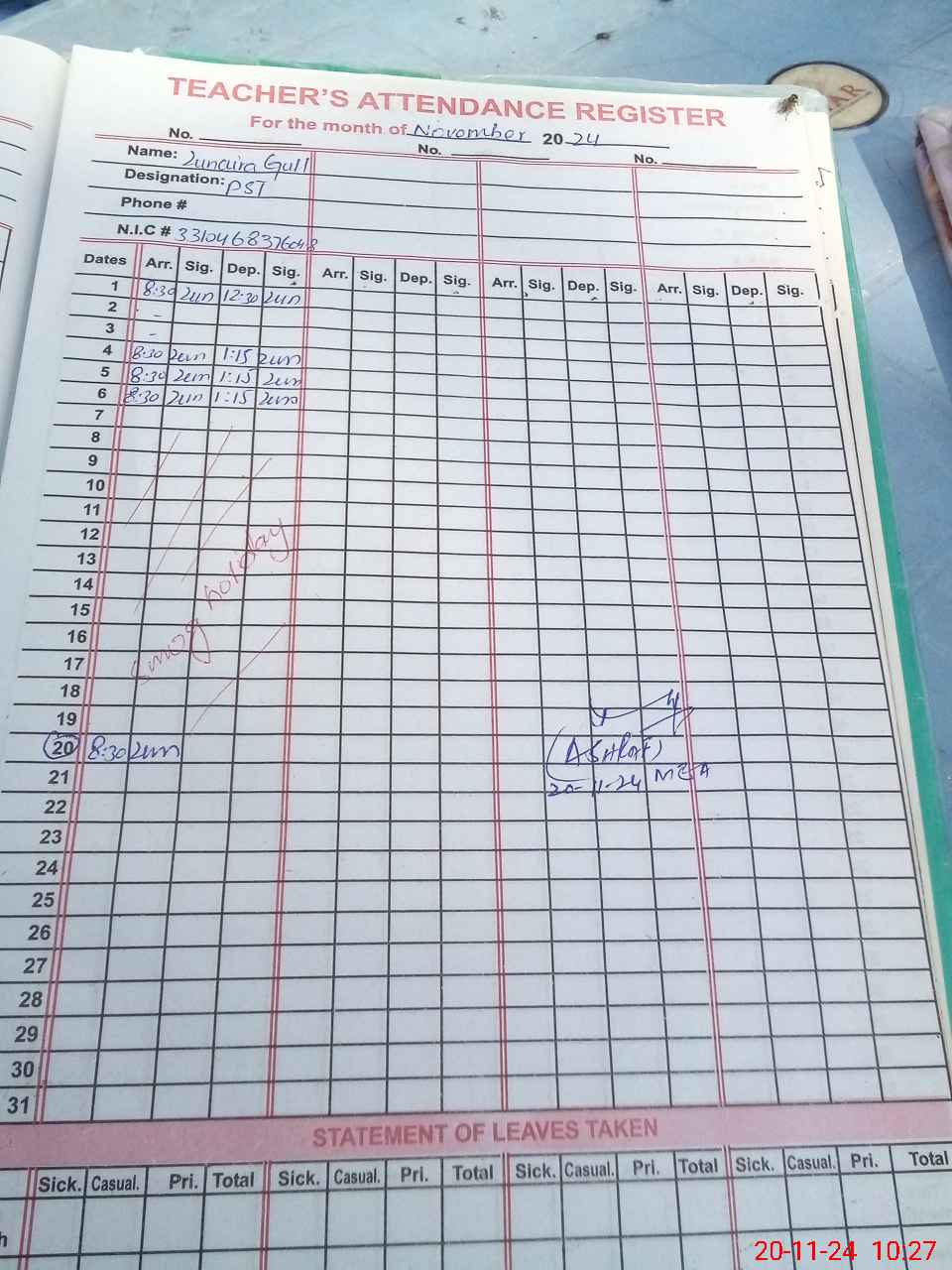 | CNIC | Full Name | Designation | R/C | Absence During Last Calender Month |