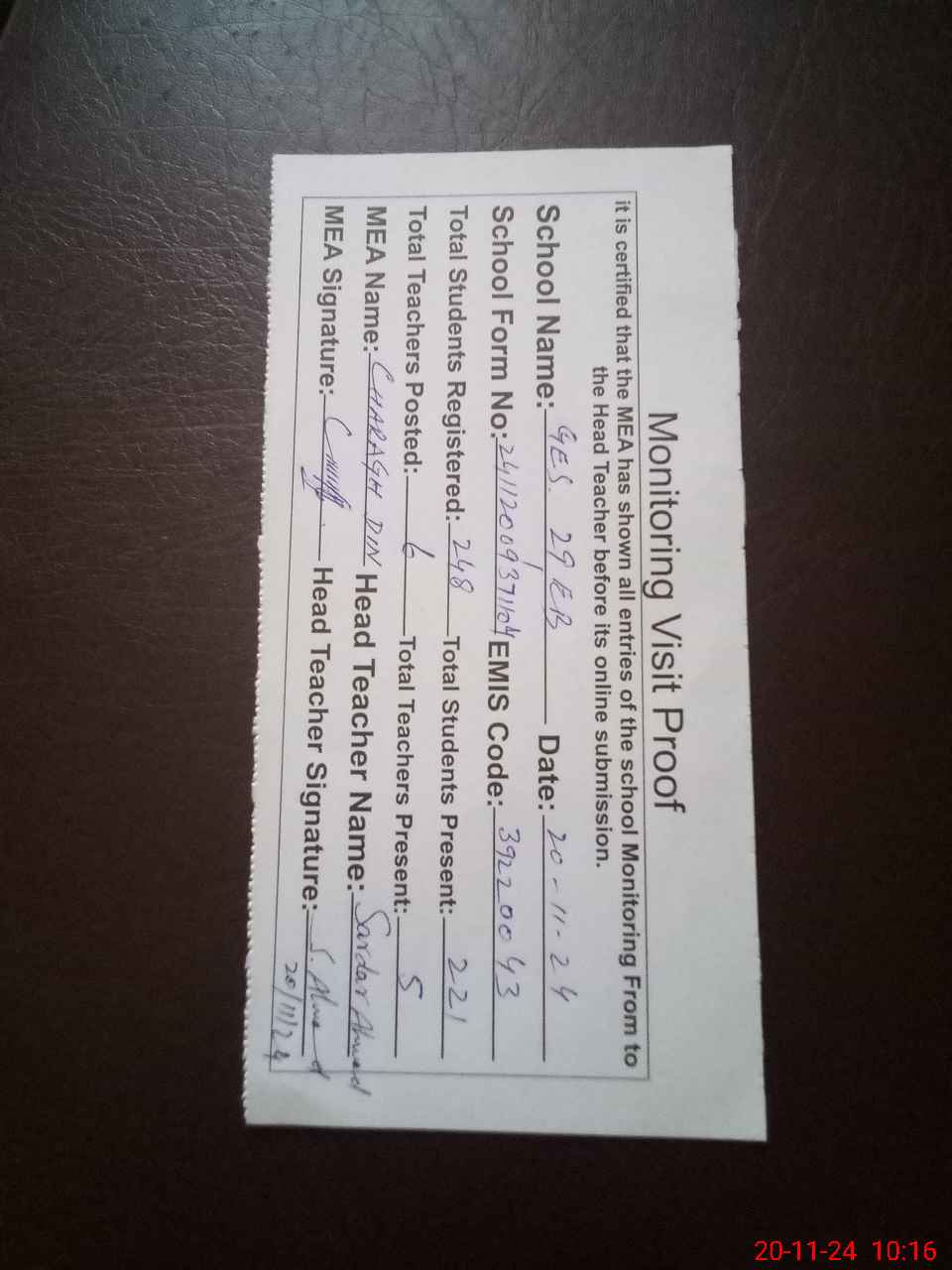 | Attendance Register | Head Teacher | MEA with School | Visit Proof |