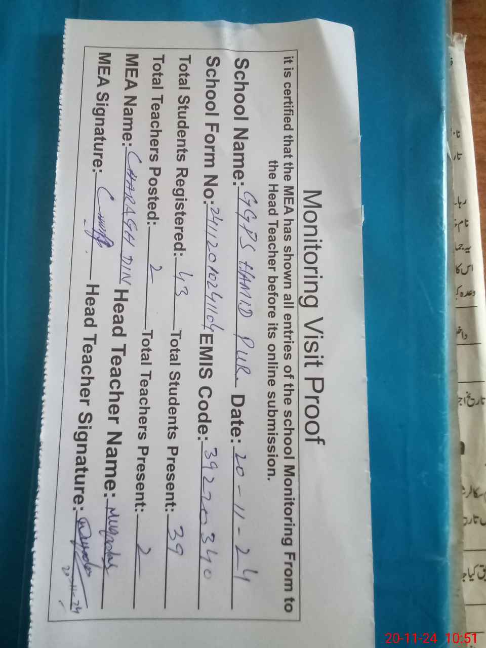 | Attendance Register | Head Teacher | MEA with School | Visit Proof |