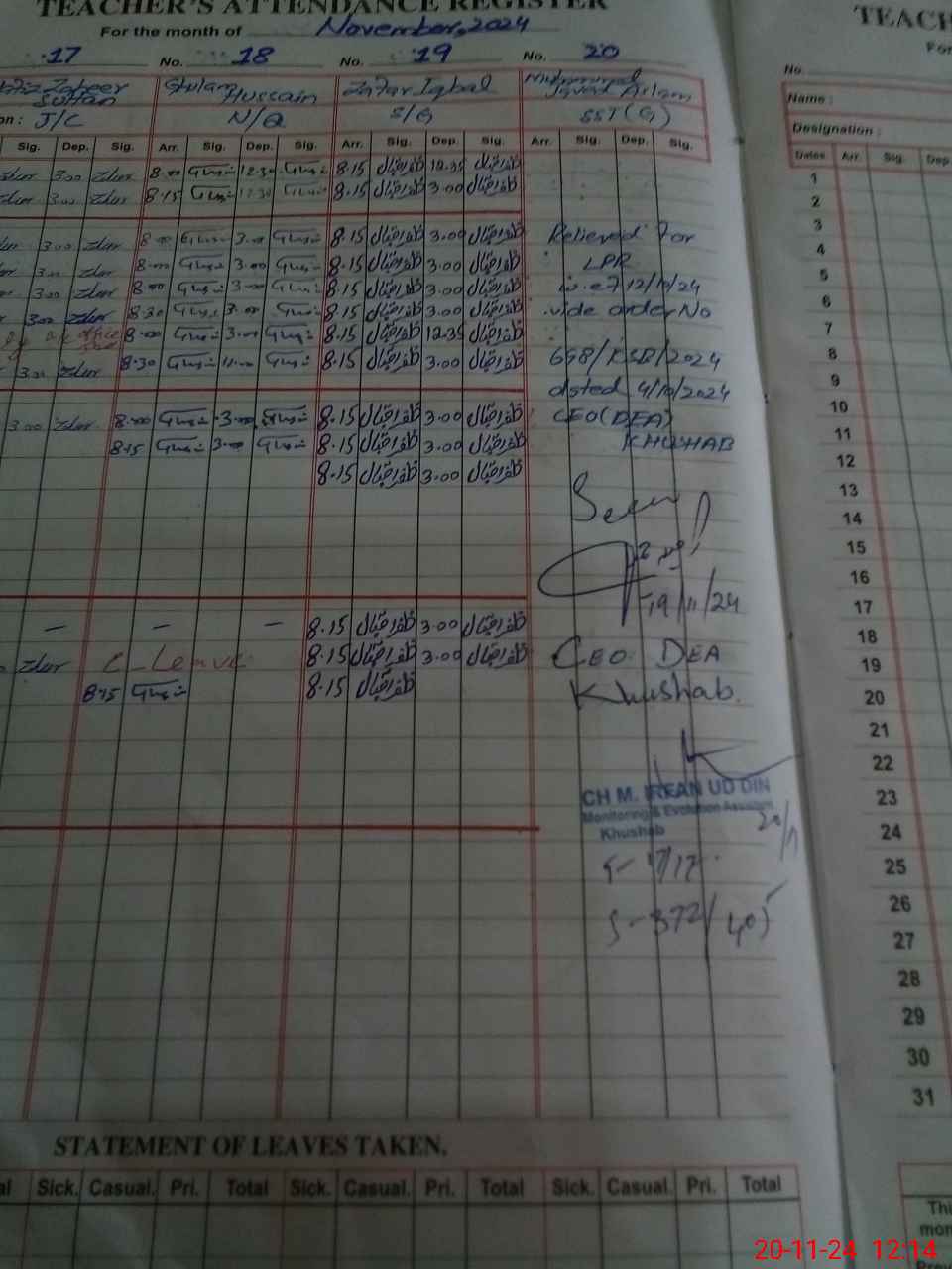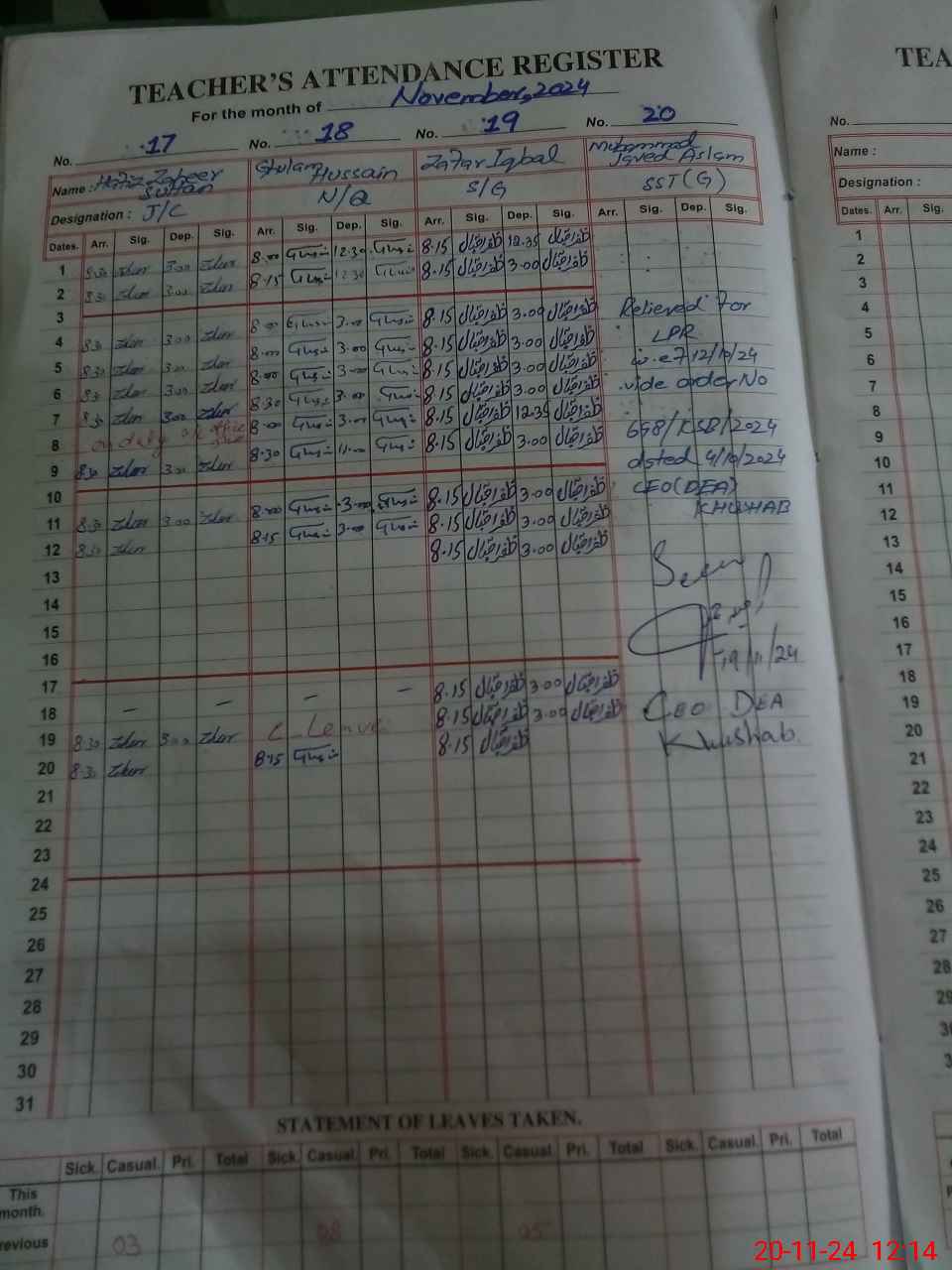 | CNIC | Full Name | Designation | R/C | Absence During Last Calender Month |