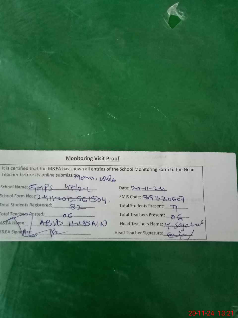 | Attendance Register | Head Teacher | MEA with School | Visit Proof |