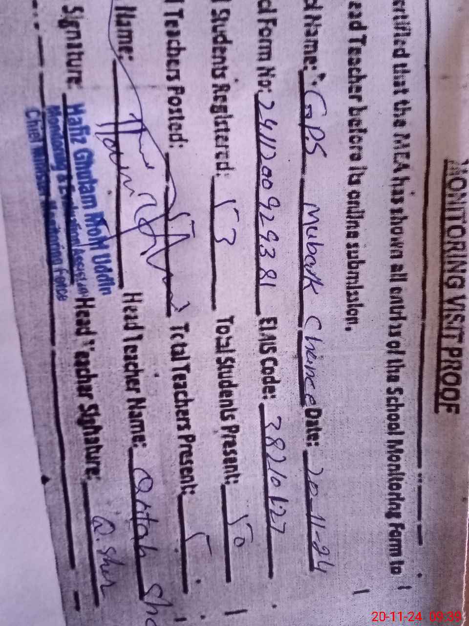 | EMIS Code: 38210127 | Name of School: GPS MUBARAK CHANWAS | |||