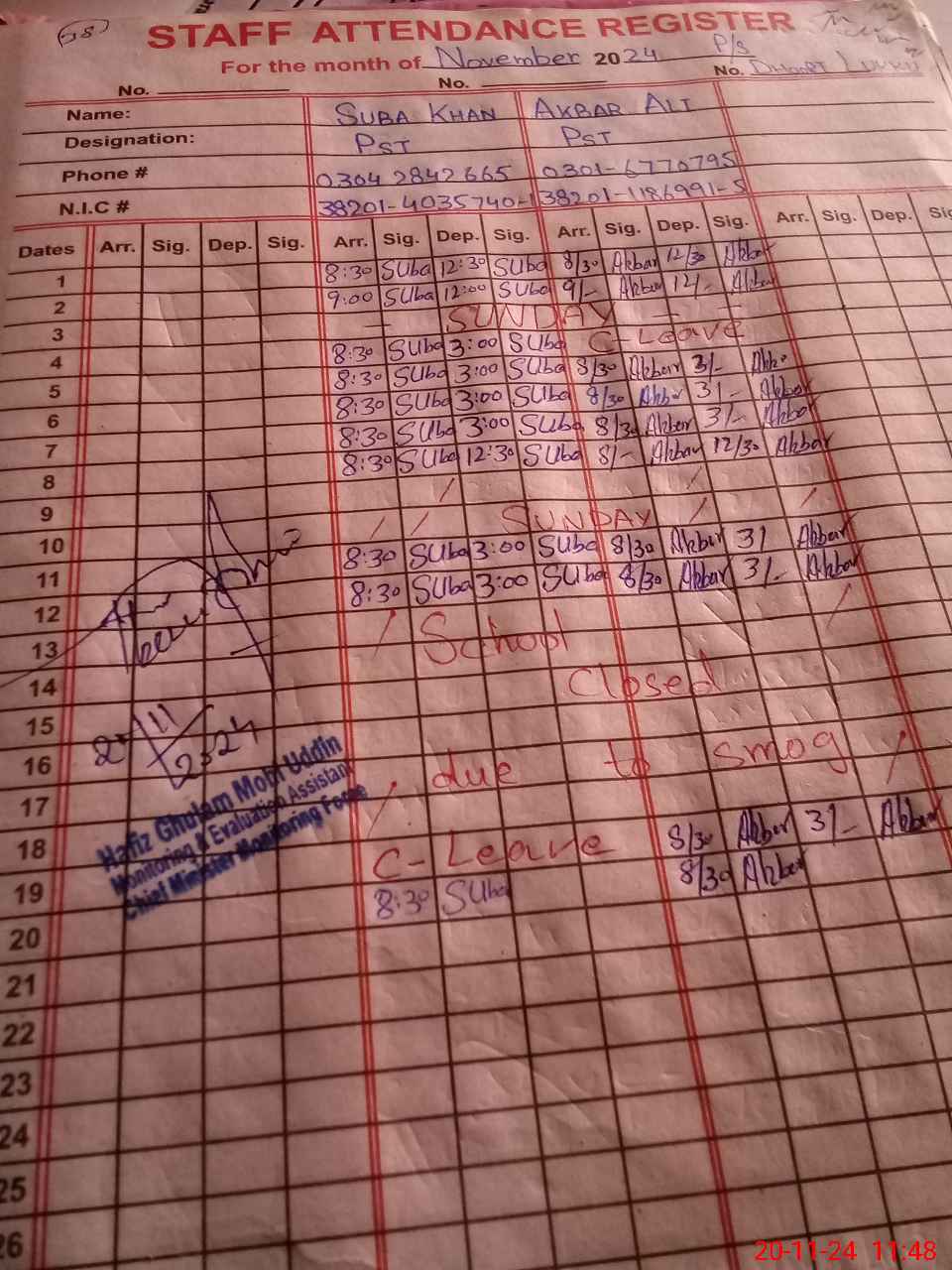 | CNIC | Full Name | Designation | R/C | Absence During Last Calender Month |
