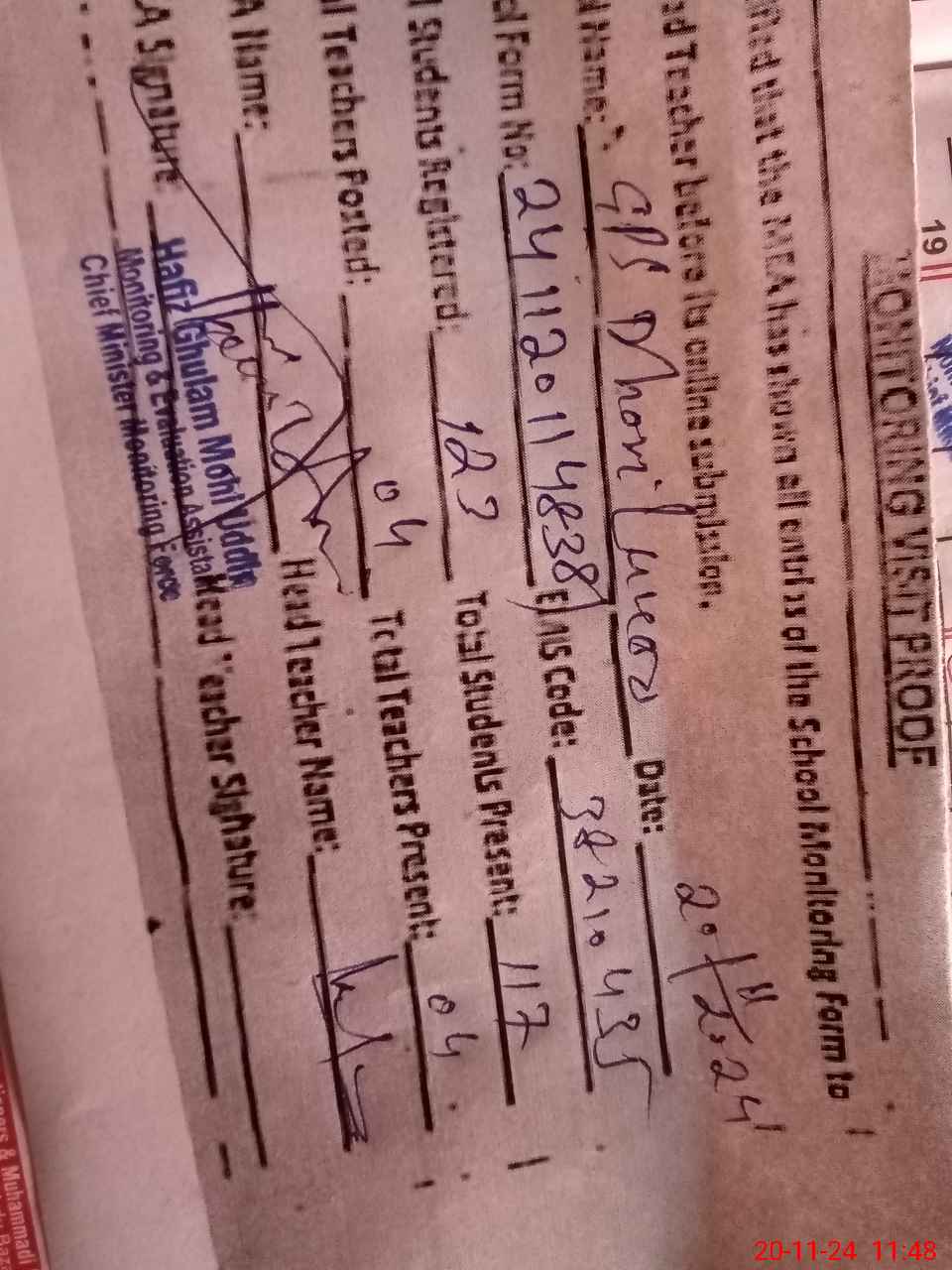 | Attendance Register | Head Teacher | MEA with School | Visit Proof |