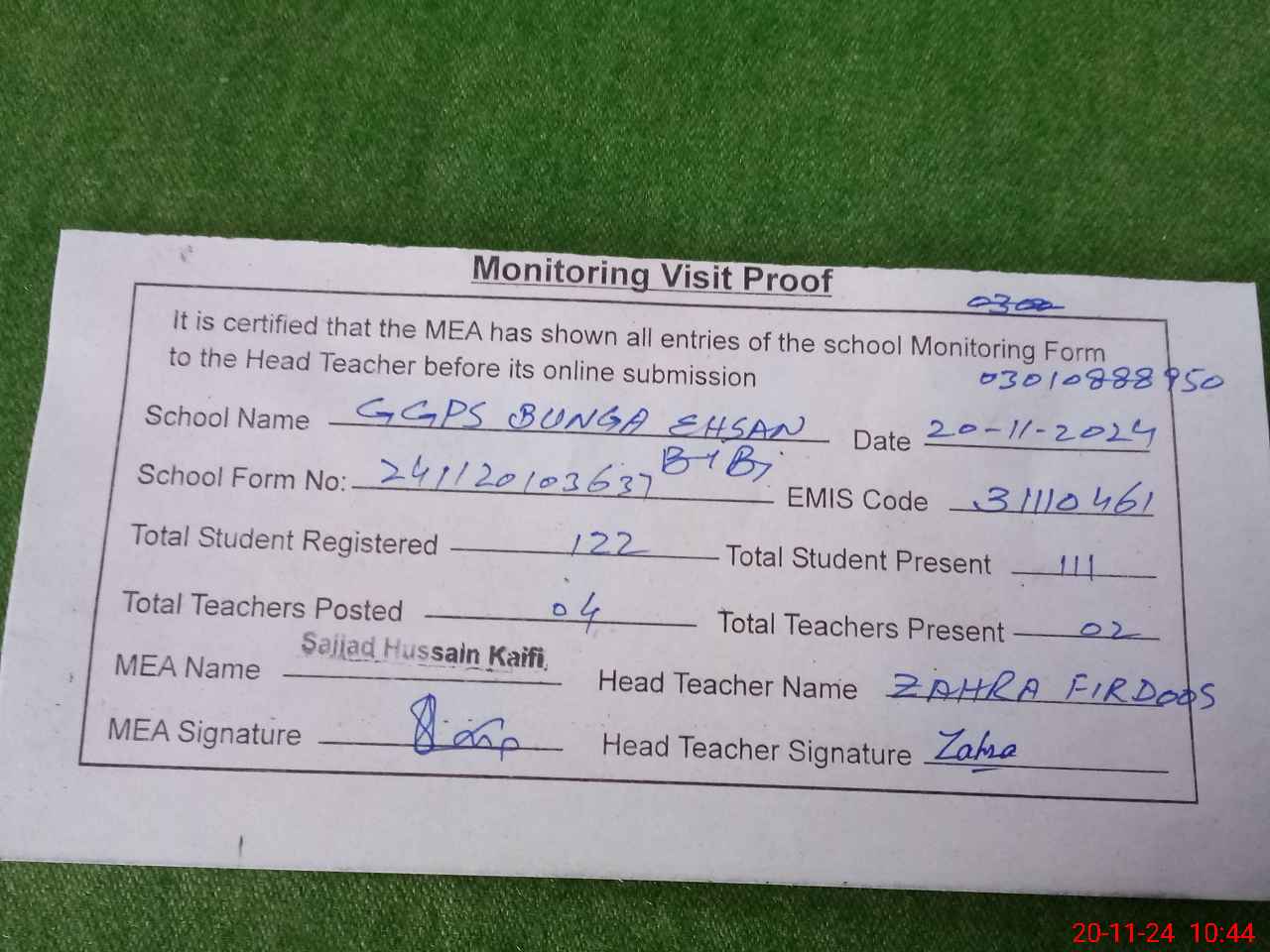 | Attendance Register | Head Teacher | MEA with School | Visit Proof |