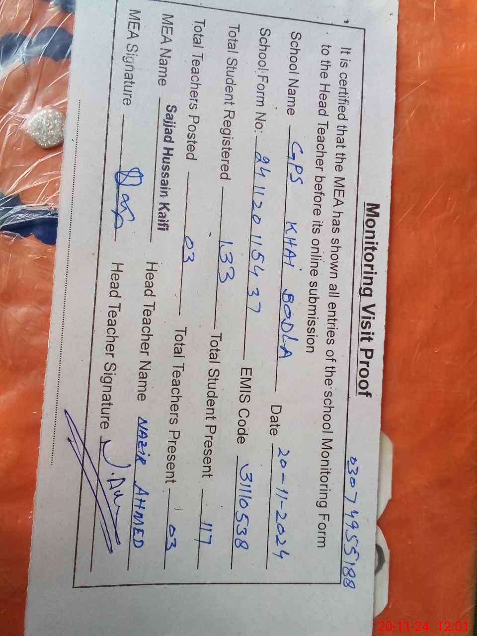 | Attendance Register | Head Teacher | MEA with School | Visit Proof |