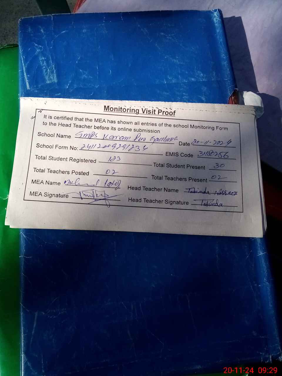 | Attendance Register | Head Teacher | MEA with School | Visit Proof |