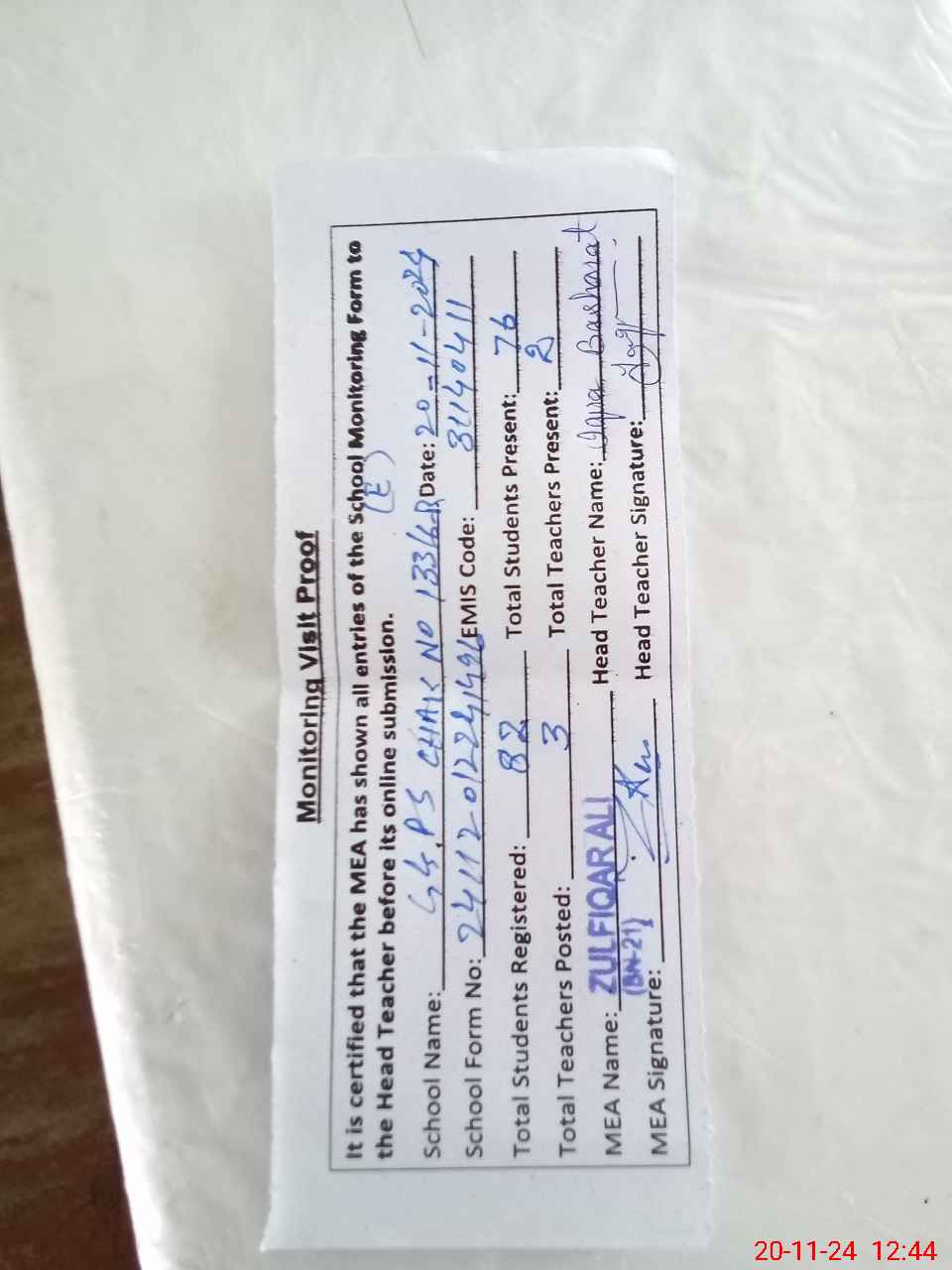 | Attendance Register | Head Teacher | MEA with School | Visit Proof |