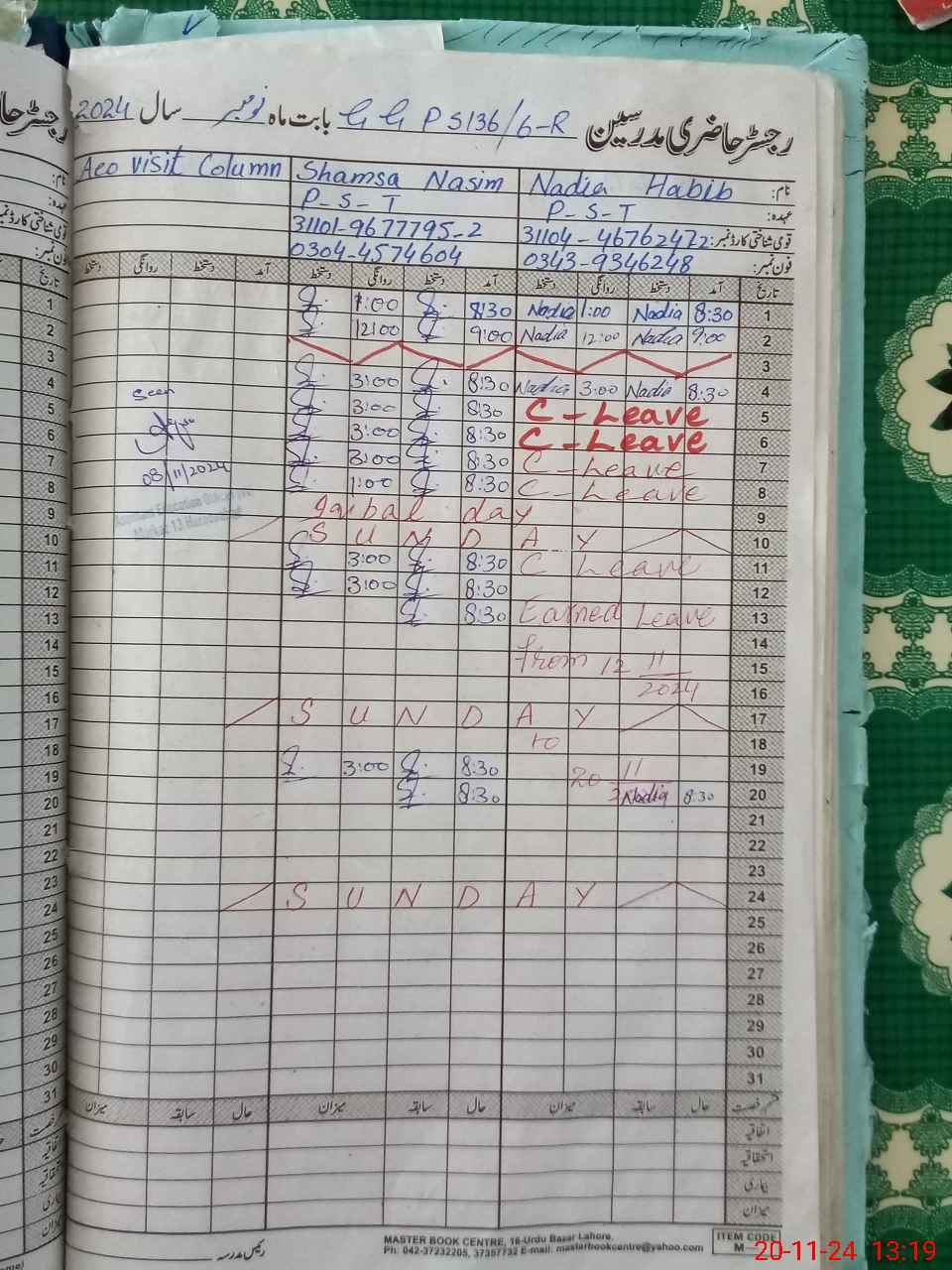 | CNIC | Full Name | Designation | R/C | Absence During Last Calender Month |