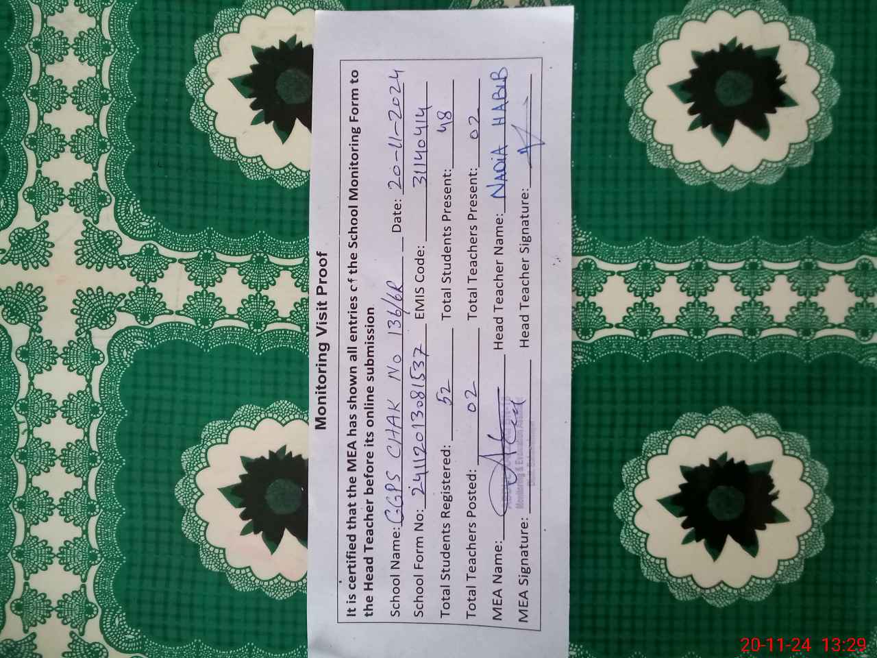 | Attendance Register | Head Teacher | MEA with School | Visit Proof |