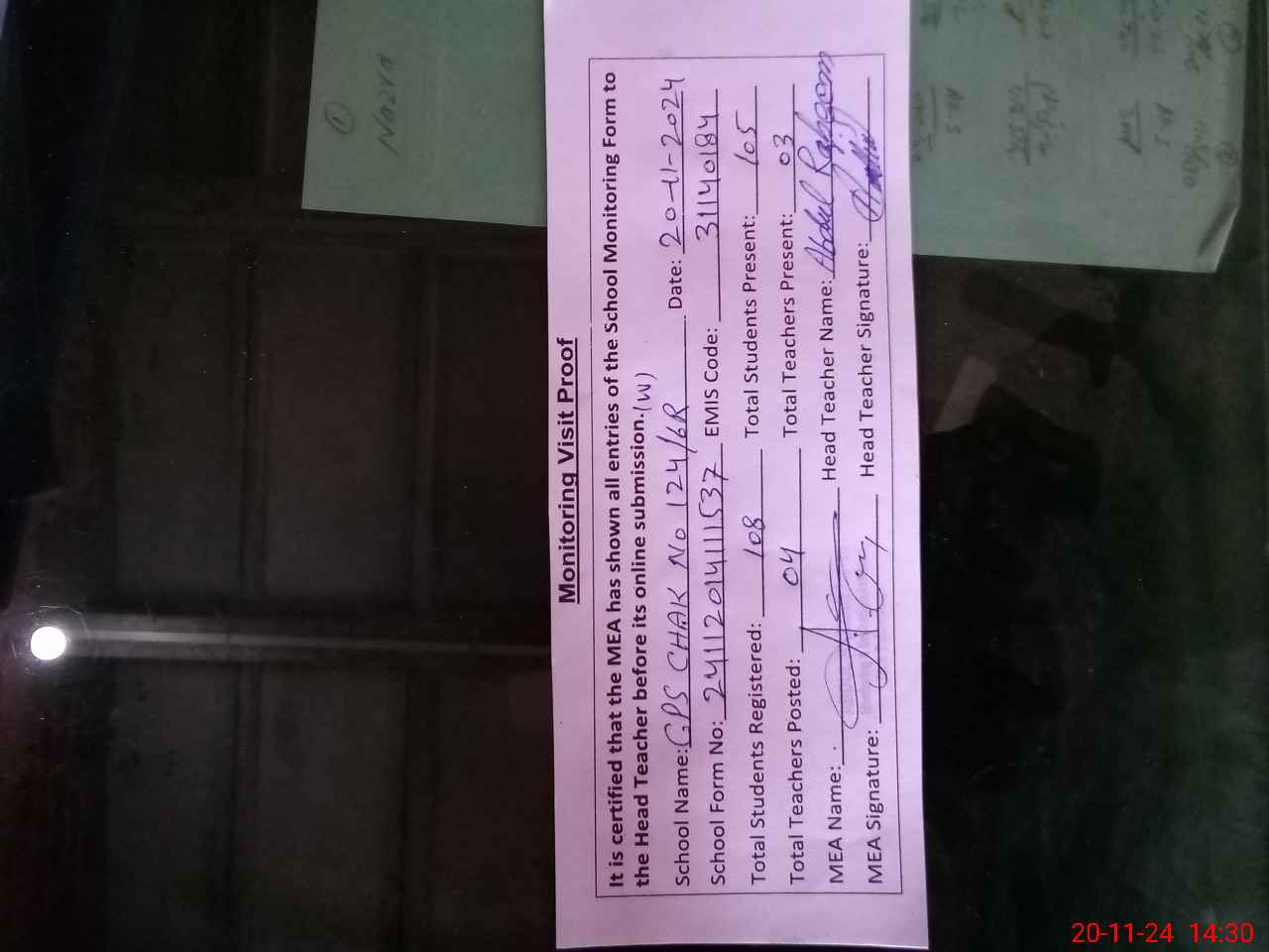 | Attendance Register | Head Teacher | MEA with School | Visit Proof |