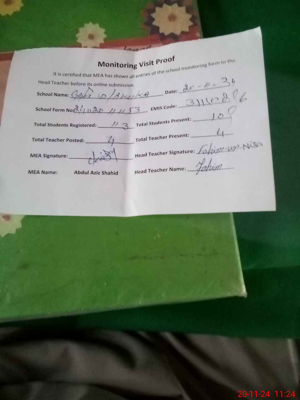 | Attendance Register | Head Teacher | MEA with School | Visit Proof |