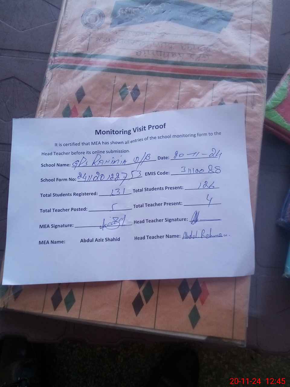 | Attendance Register | Head Teacher | MEA with School | Visit Proof |