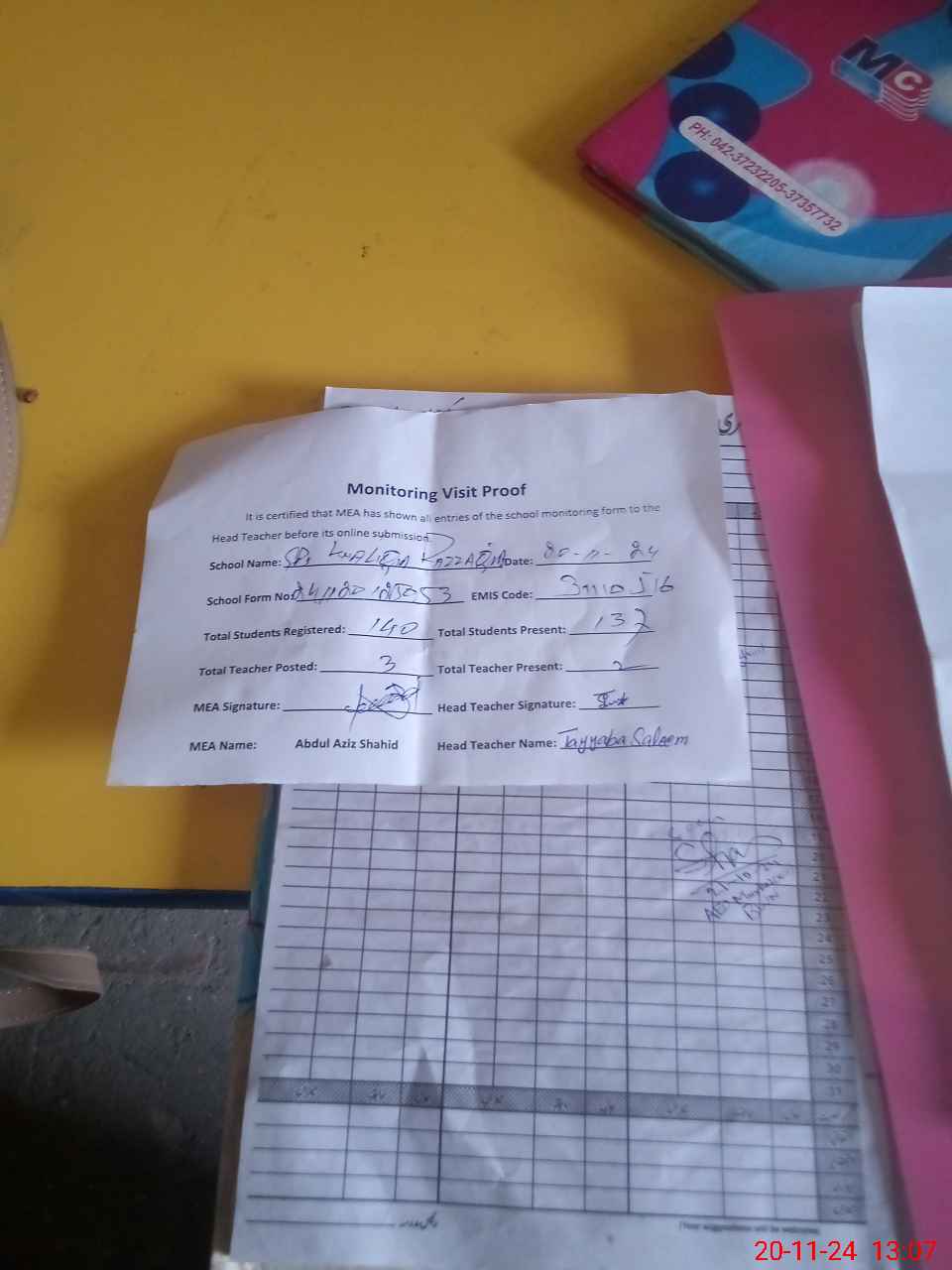 | Attendance Register | Head Teacher | MEA with School | Visit Proof |