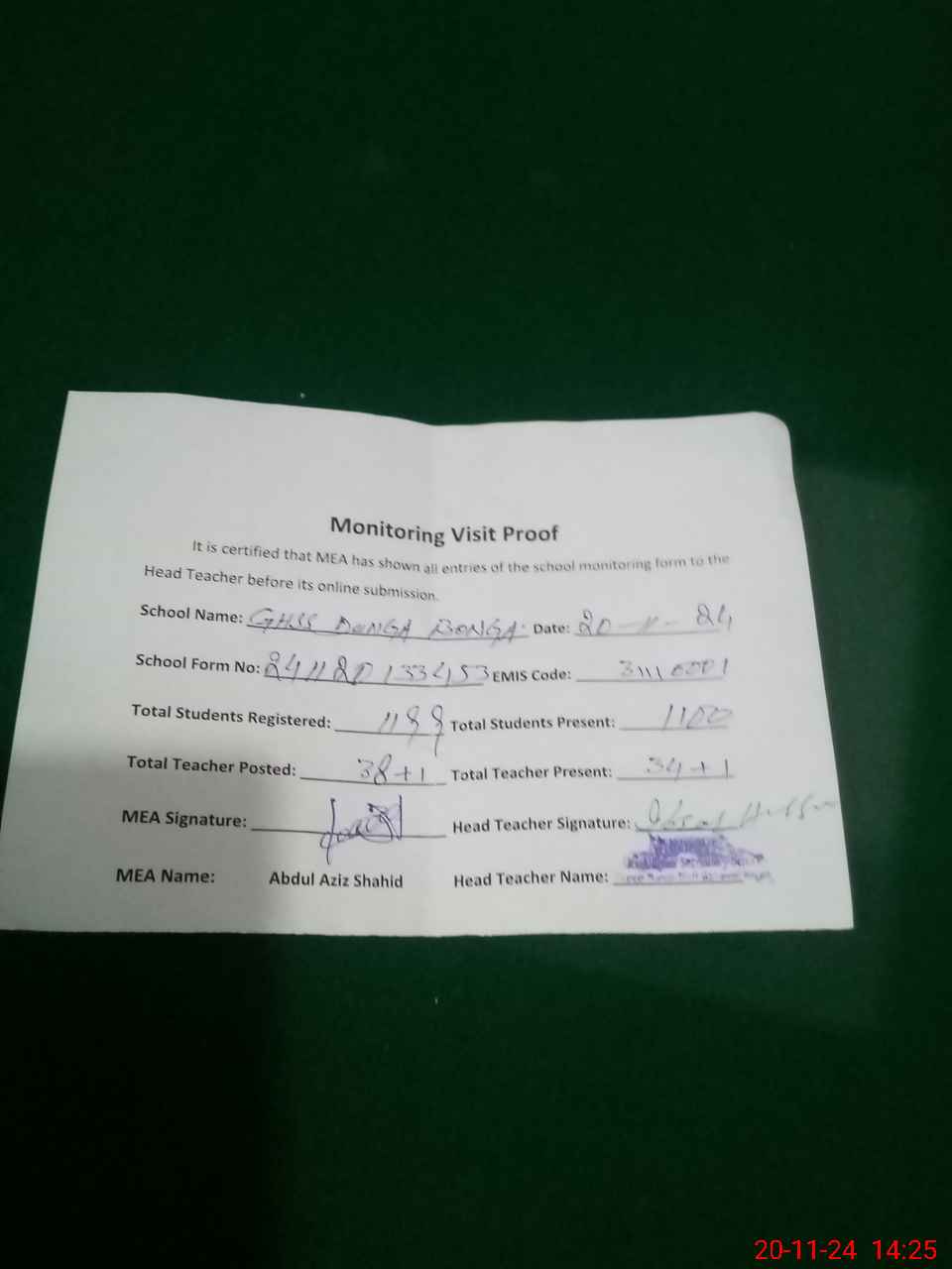 | Attendance Register | Head Teacher | MEA with School | Visit Proof |