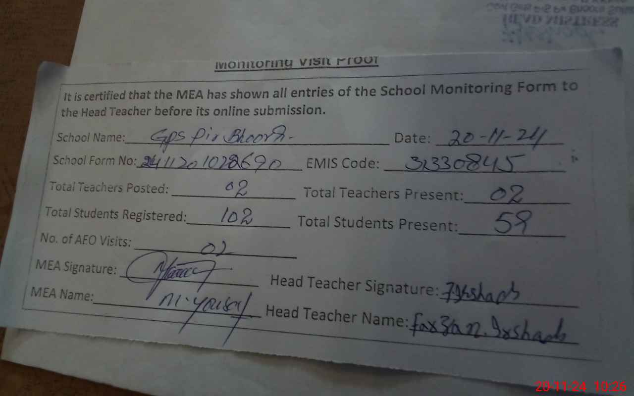 | EMIS Code: 31330845 | Name of School: GGPS PIR BHOORA SULTAN | |||