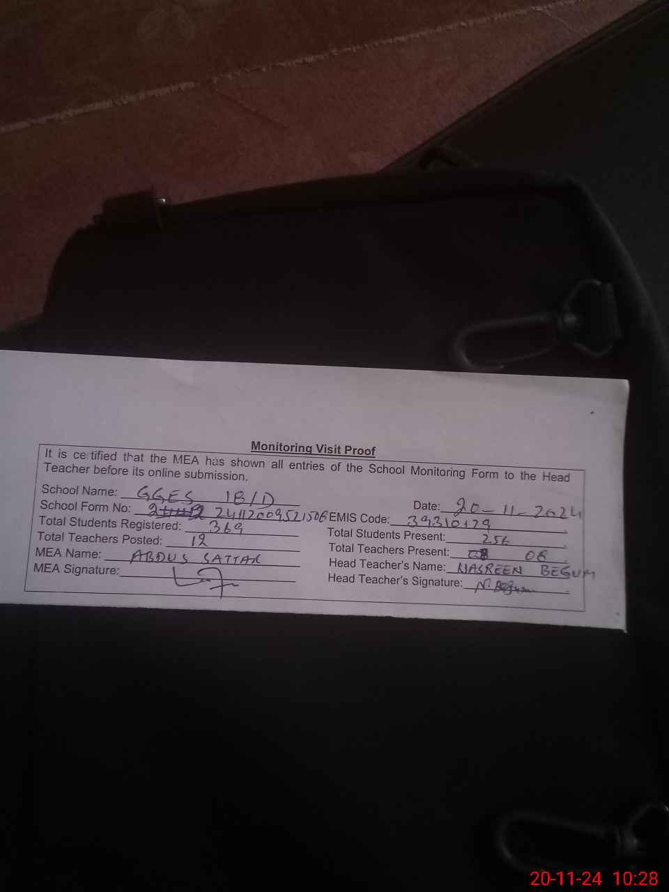 | Attendance Register | Head Teacher | MEA with School | Visit Proof |