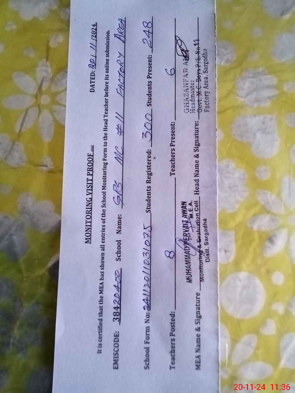 | EMIS Code: 38420400 | Name of School: GPS MC NO. 11 FACTORY AREA SARGODHA | |||