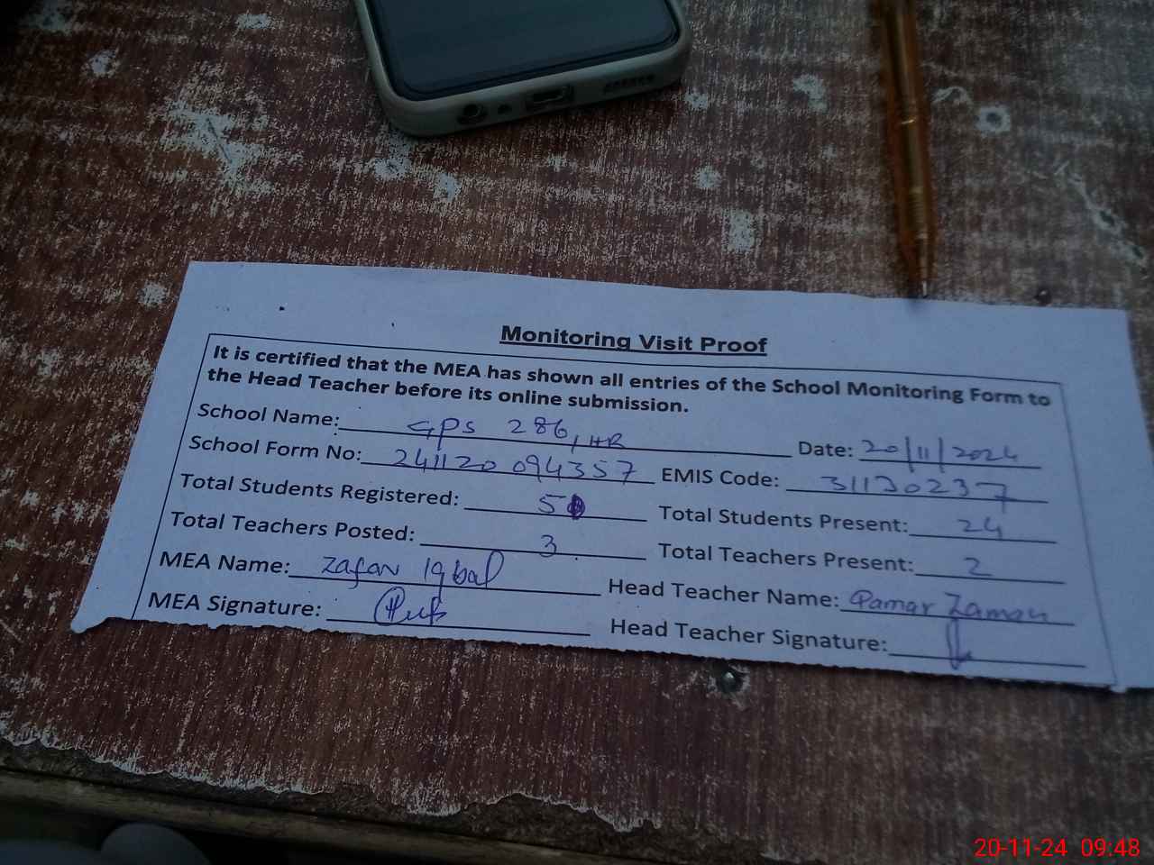 | EMIS Code: 31130237 | Name of School: GPS CHAK NO 286 HR | |||