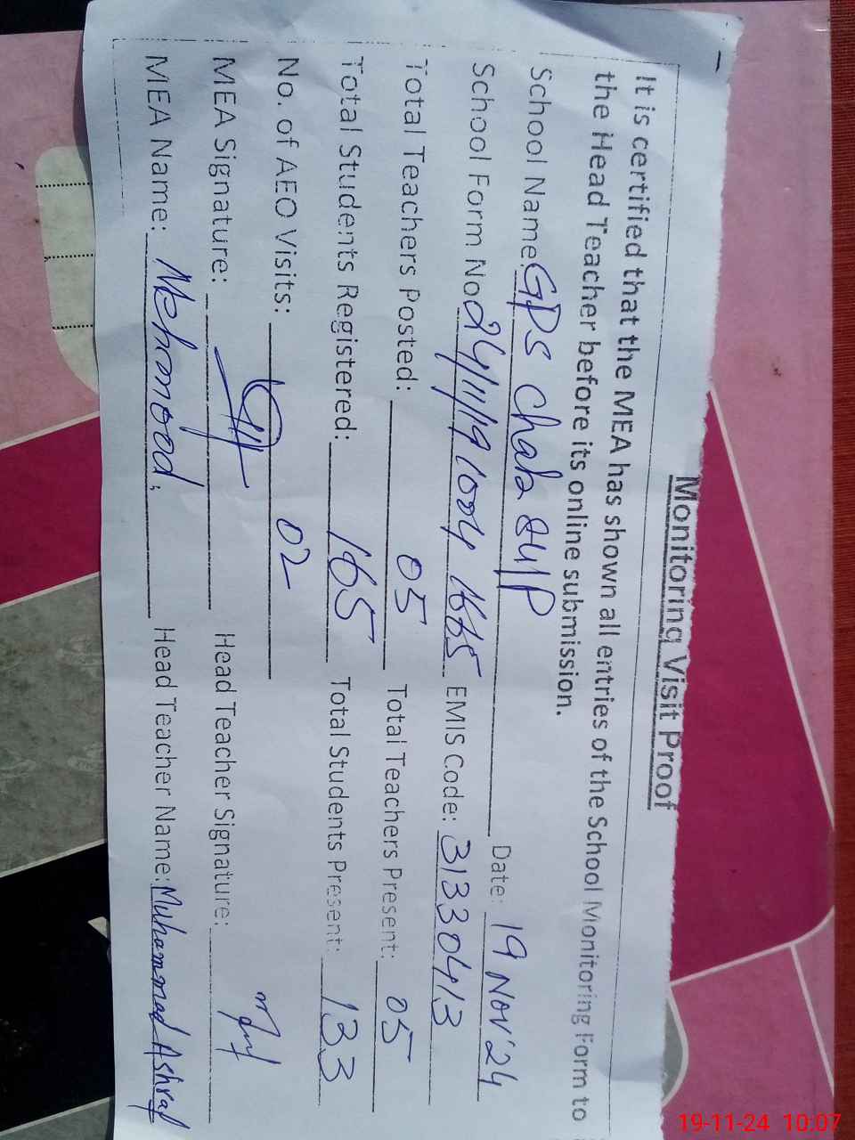 | Attendance Register | Head Teacher | MEA with School | Visit Proof |