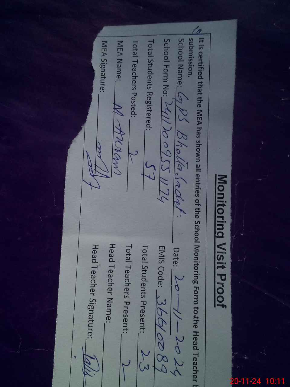 | Attendance Register | Head Teacher | MEA with School | Visit Proof |