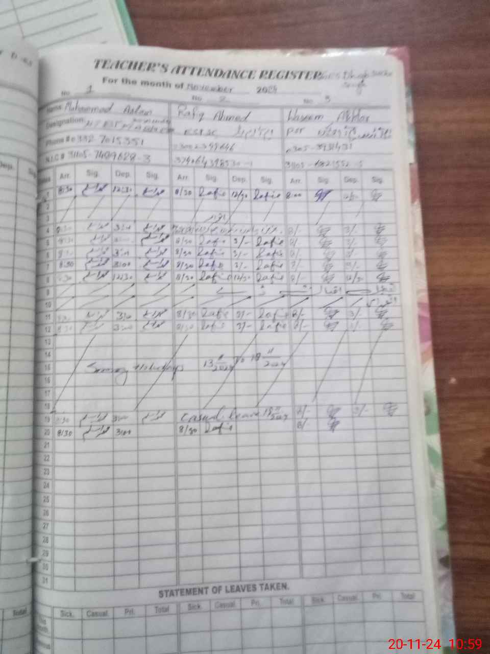 | CNIC | Full Name | Designation | R/C | Absence during last cal. month |